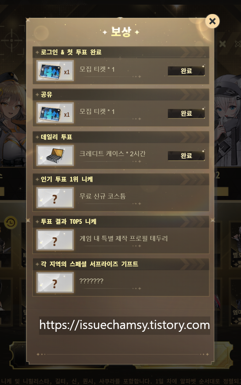 이 기간동안 투표시 첫번째 로그인&첫투표시 일반모집티켓 1개, 매일 1번씩 투표시 크레딧 케이스*2시간 1개 , 공유시 일반모집티켓 1개 , 인기투표 1위 니케는 무료 신규코스튬 , 투표결과 TOP5 니케 게임내 특별 제작 프로필 테두리를 증정한다고 합니다! 그다음 각지역의 스페셜 서프라이즈 기프트 인데 이건 각 국가 서버별로 특별하게 주는듯합니다.