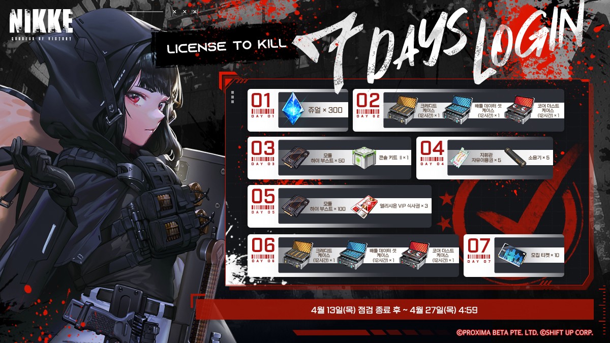 이번 License to Kill (왕관을 쓰려는 자, 그 무게를 견뎌라) 이벤트는 4월 13일 14:00 ~ 4월 27일(목) 04:59:59 까지 진행한다.