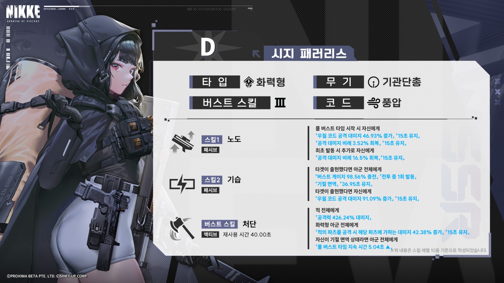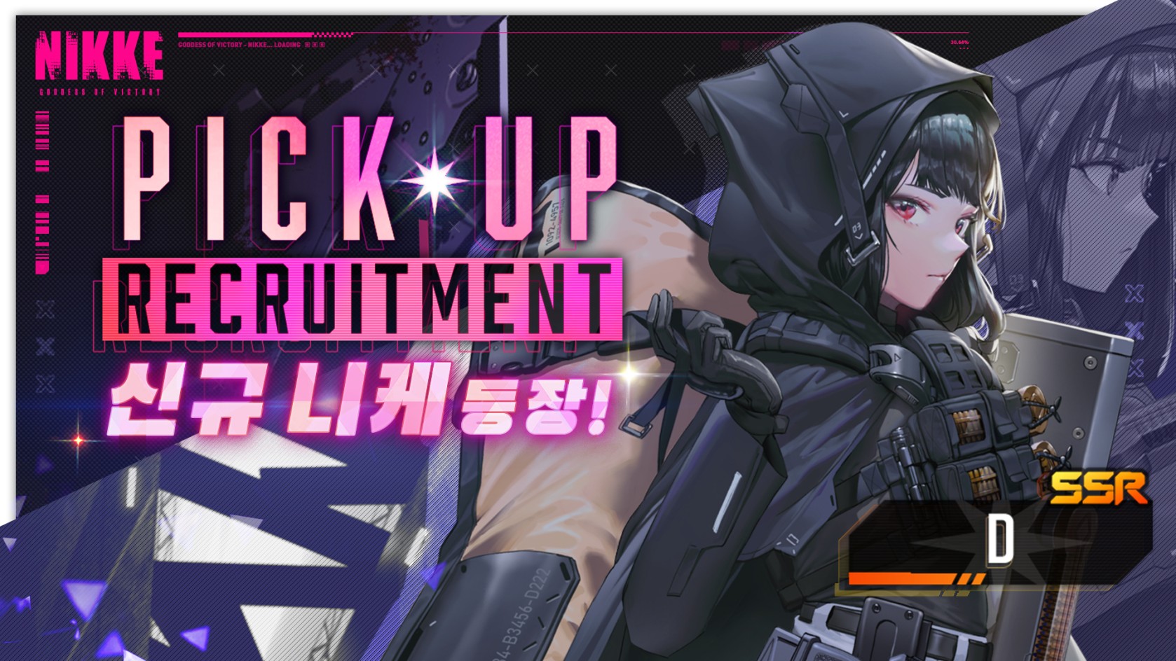 신규캐릭터 디 (D) 는 차가운 암살자로 강력한 코드공격과 다양한 강화 효과를 보유한 니케이다. 적 타겟 출현시 아군전체에게 기절 면역을 부여하고 버스트 게이지를 크게 충전시킨다. 적 파츠를 공격시 해당 파츠에 입히는 데미지 증폭효과가 있으며 조건부로 풀 버스트 지속시간을 증가시키고 장시간 큰 데미지 효과를 부여한다. 사용무기는 스톰센터(smg)를 사용하며 화력형 타입의 니케이다. 코드는 풍압이며 버스트스킬Ⅲ 를 사용한다.