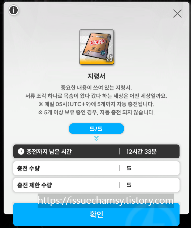 스테이지를 진행하기 위해서는 지령서가 필요한데 매일 오전 05:00에 5개씩 충전된다.