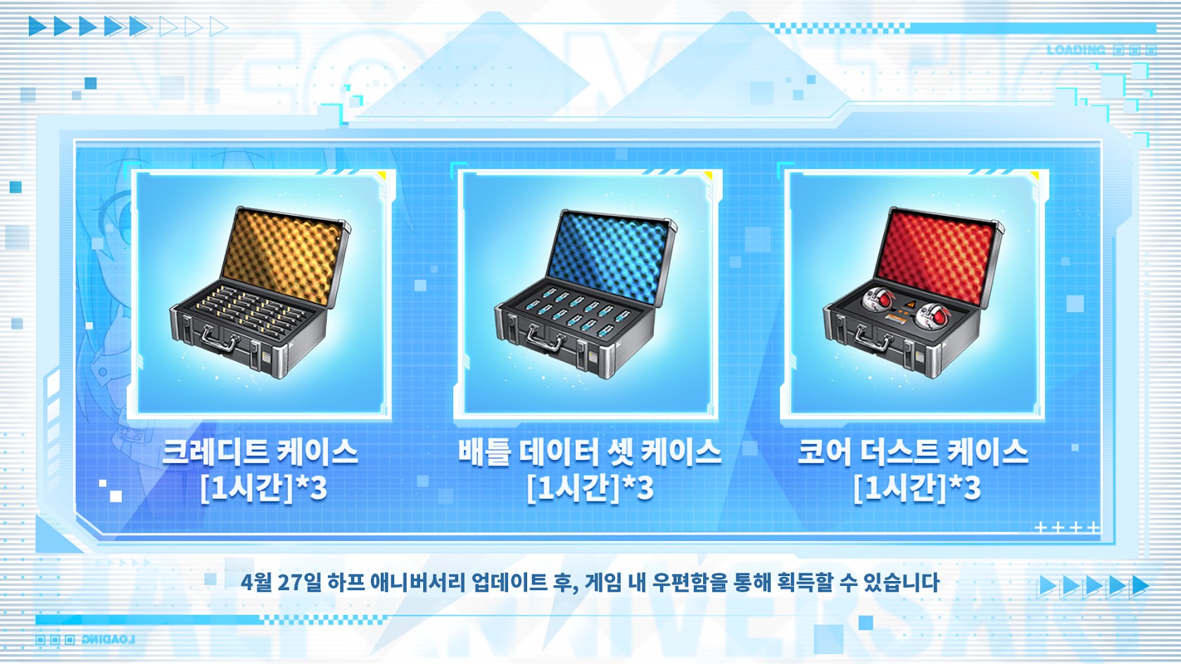 - 크레디트 케이스 (1시간) * 3, 배틀 데이터 셋 케이스 (1시간) * 3, 코어 더스트 케이스 (1시간) * 3