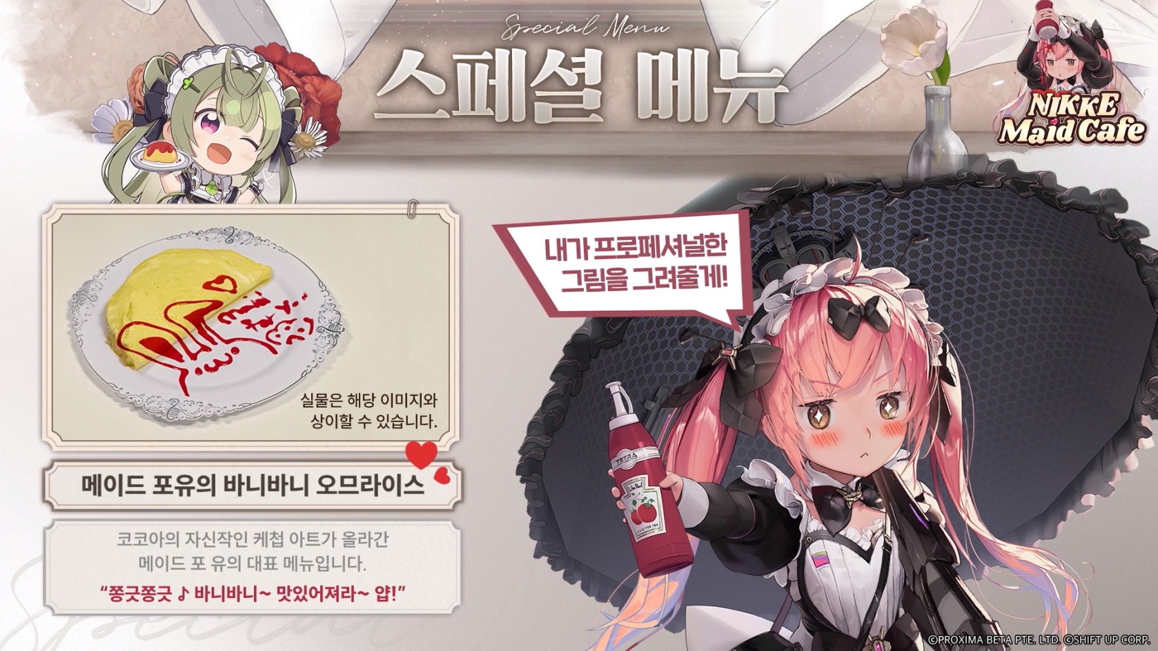 등이 제공된다고 합니다! 각 니케들의 캐릭터에 맞게 식음료들을 현실에서 반영했네요!! 방주의 치즈맛 퍼펙트가 궁금하지만 사실 오므라이스가 젤 궁금하네요 마치 다나카상이 생각나네요 고추가루를 나ㄹ려~모에모에 뀽! ㅋㅋㅋㅋㅋㅋㅋ