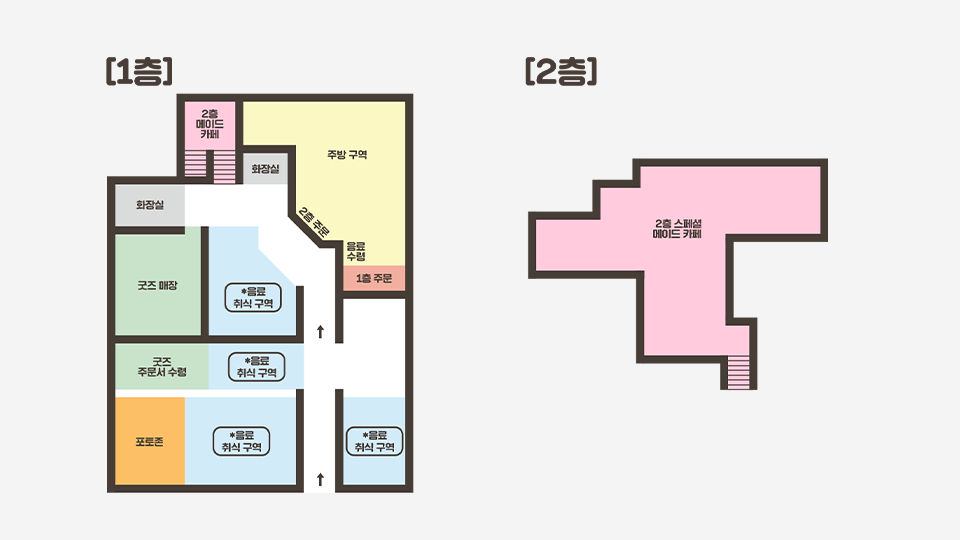 - [2층 스페셜 메이드 카페]에 입장하시는 주인님께선 구입한 음료를 직접 2층으로 가지고 올라가셔야 하며,