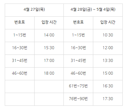※ 번호표 및 입장 시간표는 현장 상황에 따라 달라질 수 있습니다.