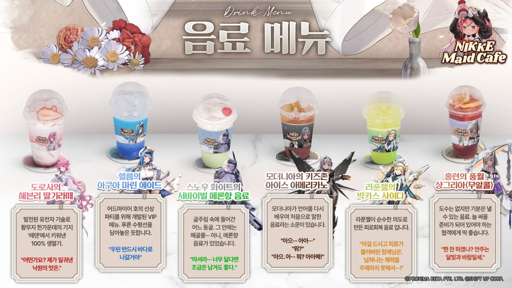 - 음료는 [1층 니케 낙원 카페]에 입장하시는 주인님, [2층 스페셜 메이드 카페]에 입장하시는 주인님 모두 주문 가능합니다.