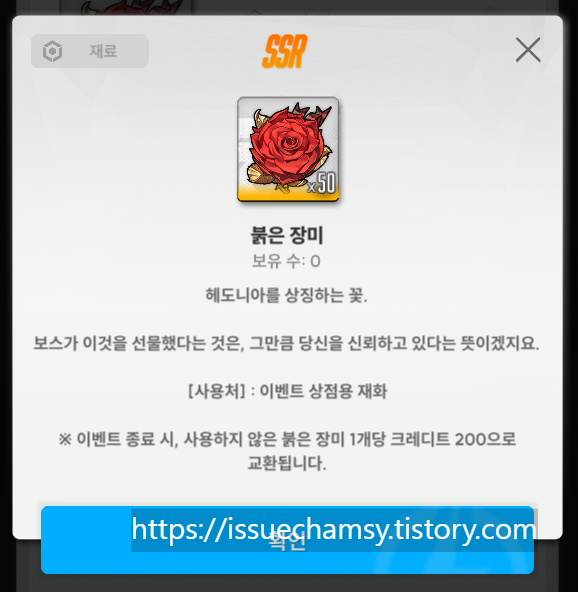 이벤트 스테이지 진행완료와 미션달성시 지급받는 이벤트 재화로 붉은장미를 얻을수있다. 이것으로 이벤트 상점에서 재화로 이용이 가능하다.