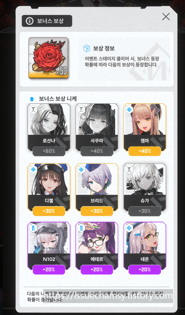 보너스 보상 니케로 100% 이상으로 스쿼드를 편성하여 스테이지 진행시 추가 보상을 획득할수있다.
