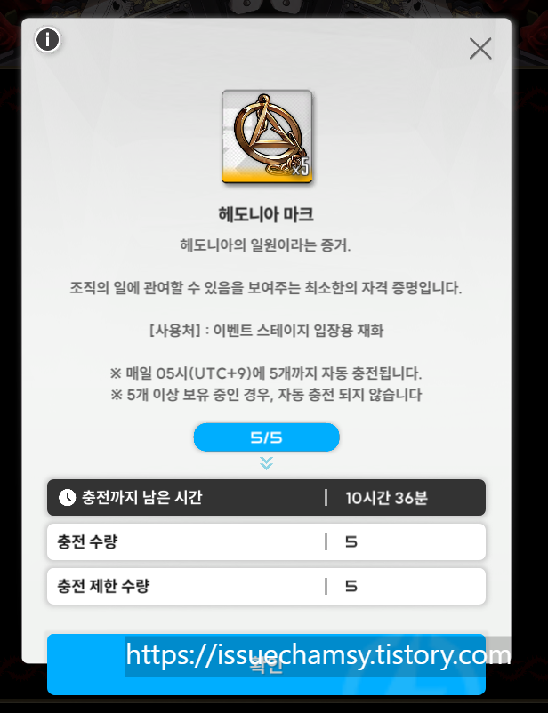 이벤트 스테이지를 진행하기 위해서는 헤도니아 마크가 필요한데 매일 오전 5시에 5개씩 충전되고 상점에서 이벤트 재화로 입장권을 구매할수있다.