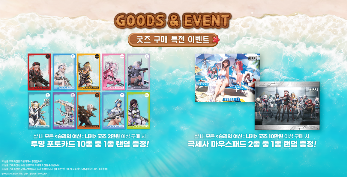 2. 샵 내 모든 <승리의 여신: 니케> 굿즈 구매 2만원, 10만원 당 특전이 랜덤으로 증정됩니다.(카운터 증정)