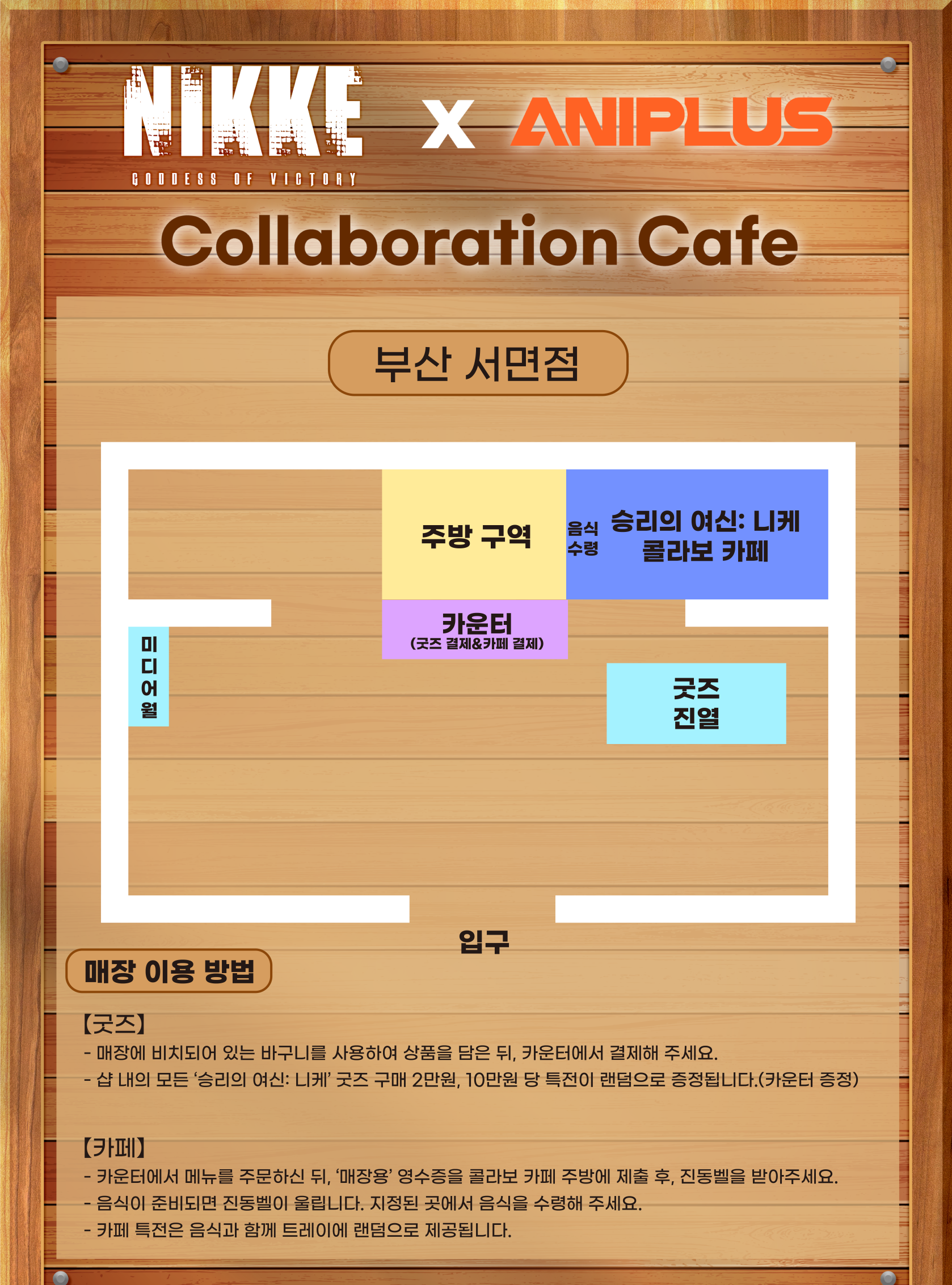 - <승리의 여신: 니케> x ANIPLUS 콜라보 카페는, 별도의 사전 예약 없이 현장 대기로 입장하실 수 있습니다.