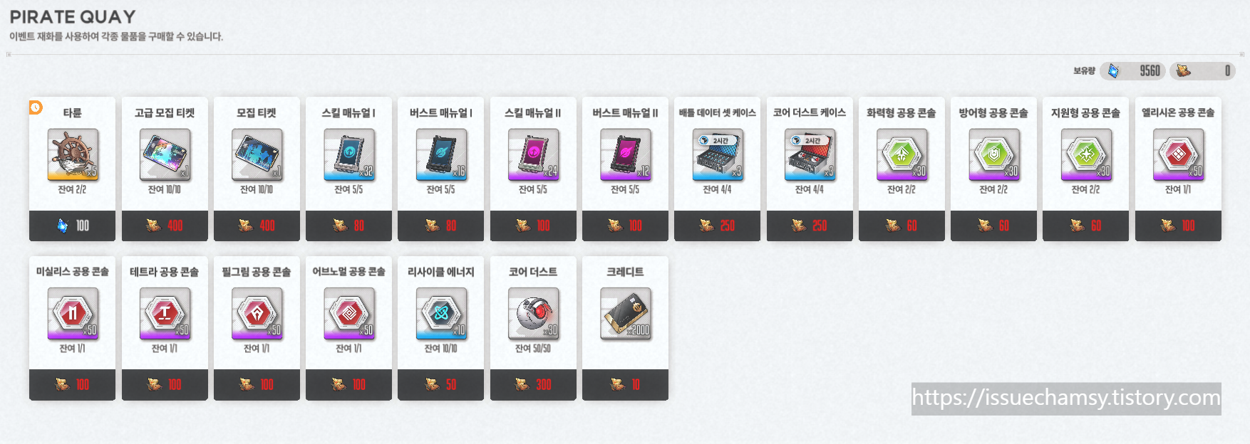 이벤트 재화를 이용하여 상점에서 각종 육성재료와 고급모집티켓, 일반모집티켓, 스킬재료, 입장권, 콘솔등을 구매가능하다.