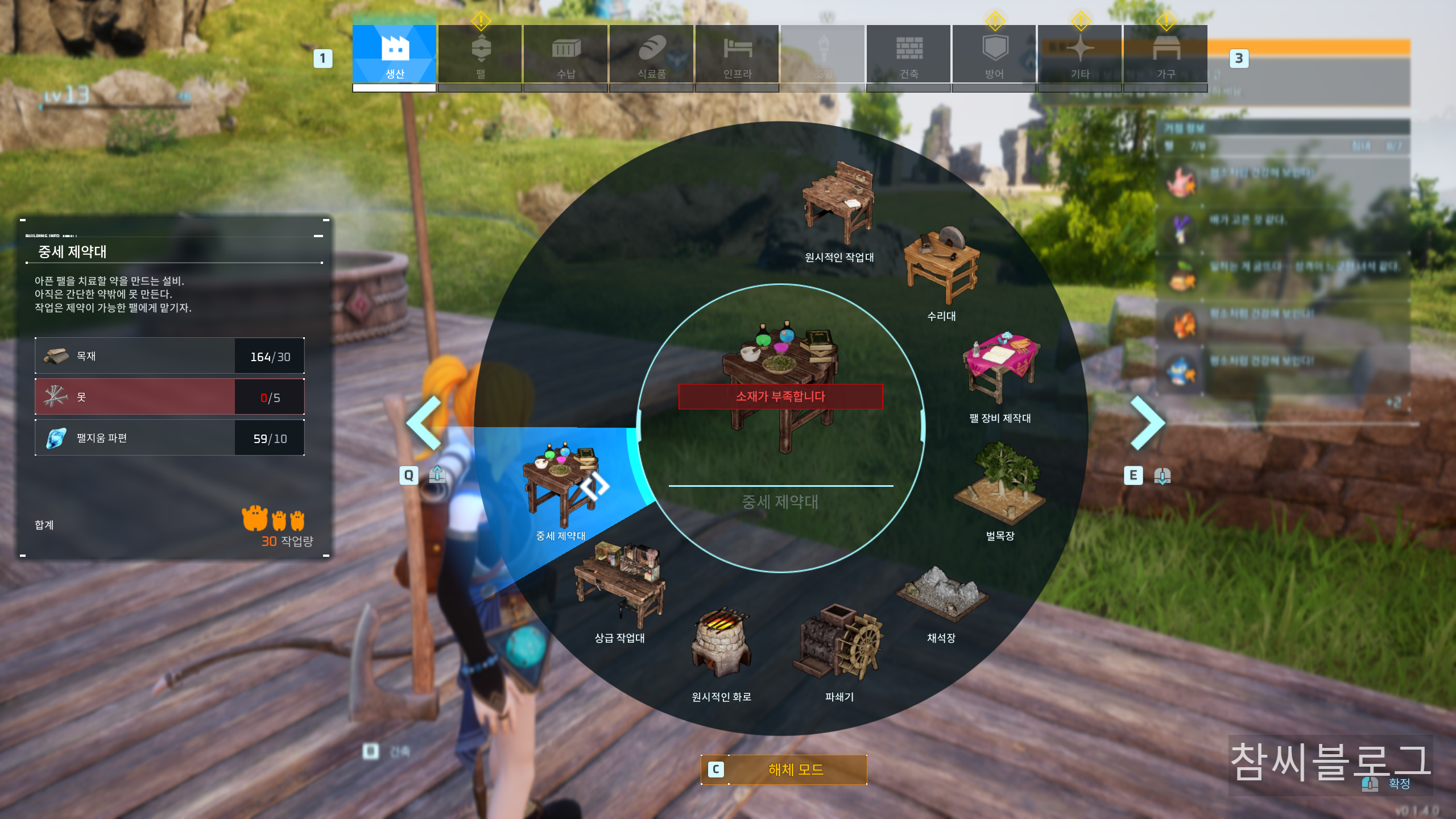 *중세 제약대 : 목재 30 , 못 5 , 팰지움 파편 10 필요