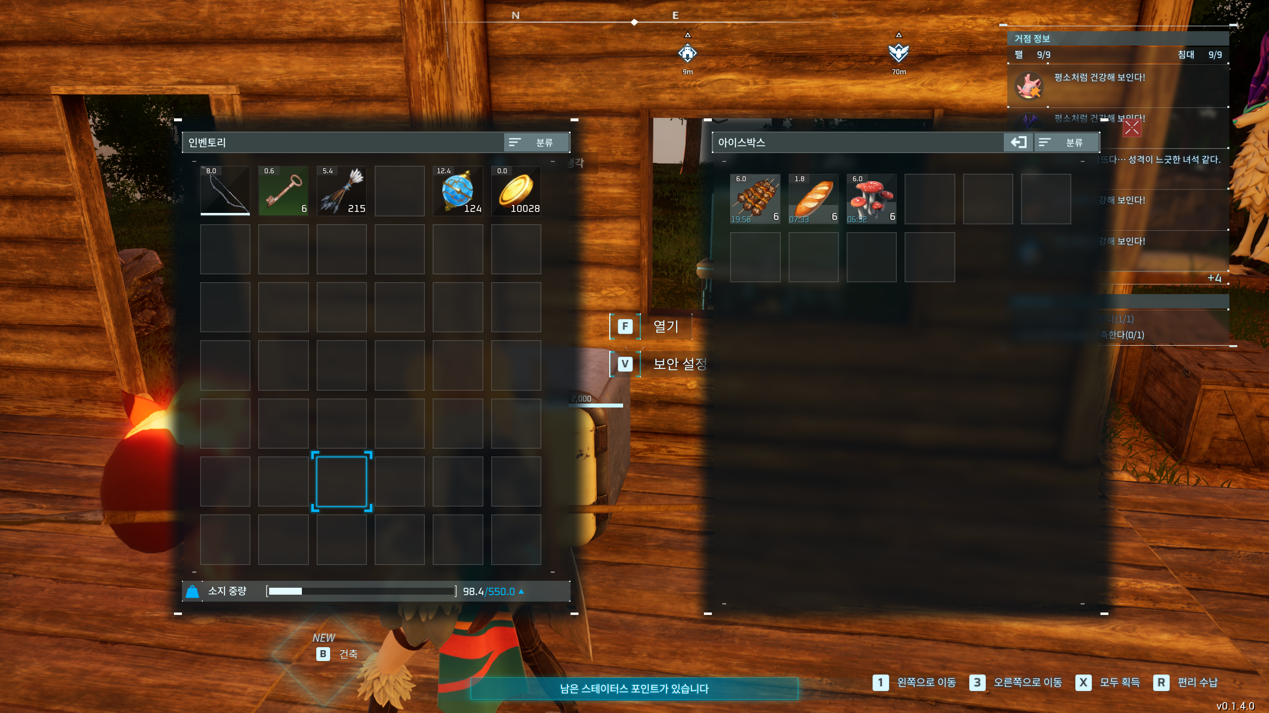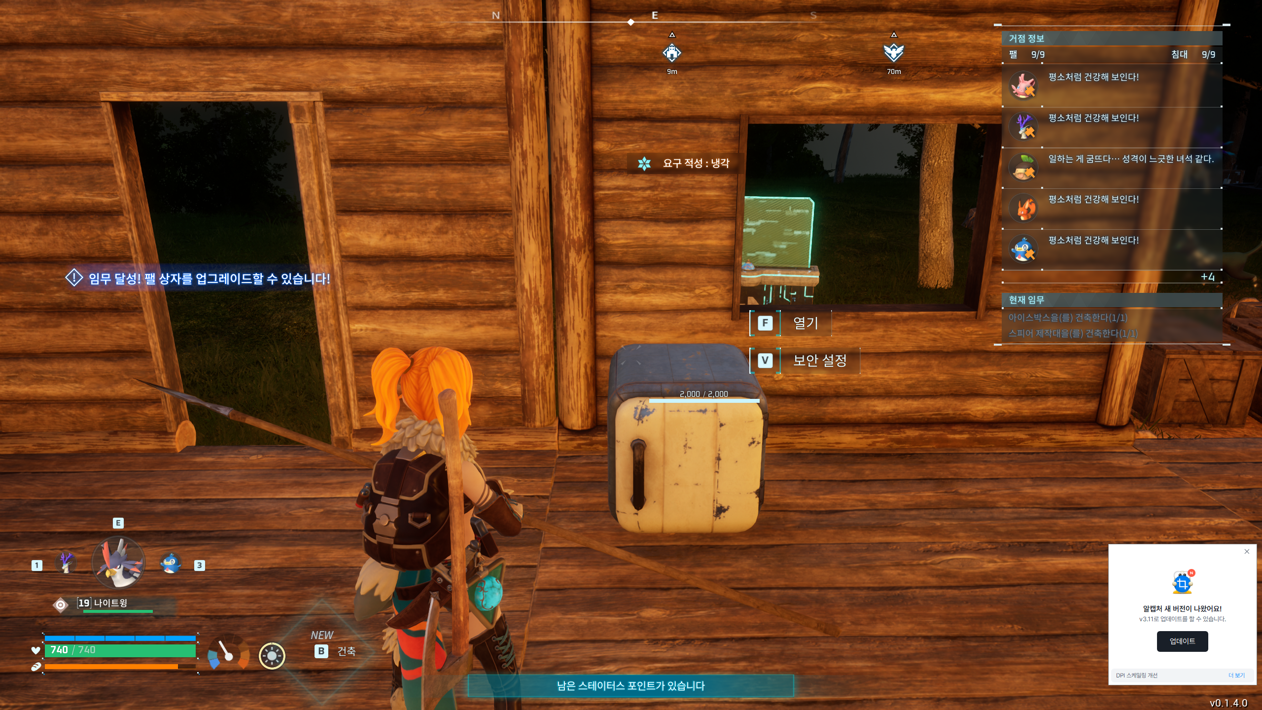 거점레벨 9 퀘스트이다. 아이스박스, 스피어 제작대를 건설해야한다...!