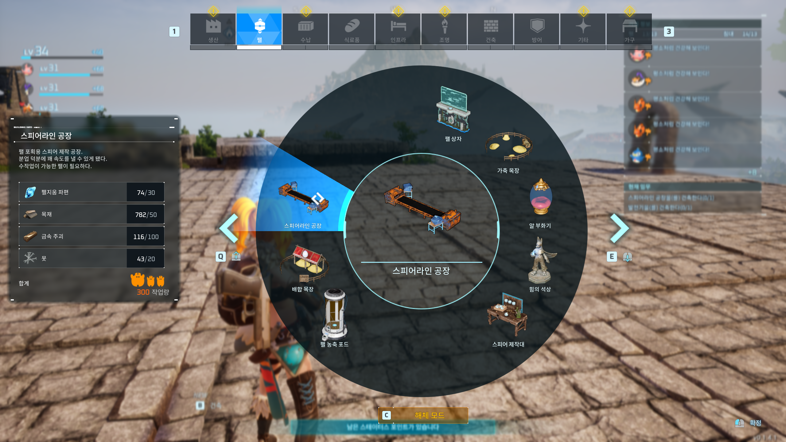 *스피어라인 공장 : 팰지움파편 30, 목재50, 금속주괴100, 못,20 필요