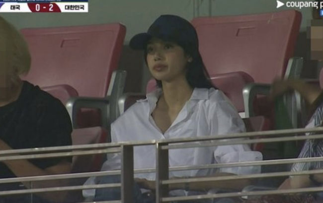 2026 북중미 월드컵 아시아 2차 예선 C조 4차전 경기에서 한국과 태국이 맞붙은 가운데 걸그룹 블랙핑크 리사가 응원하는 모습이 중계카메라에 포착되었다.
