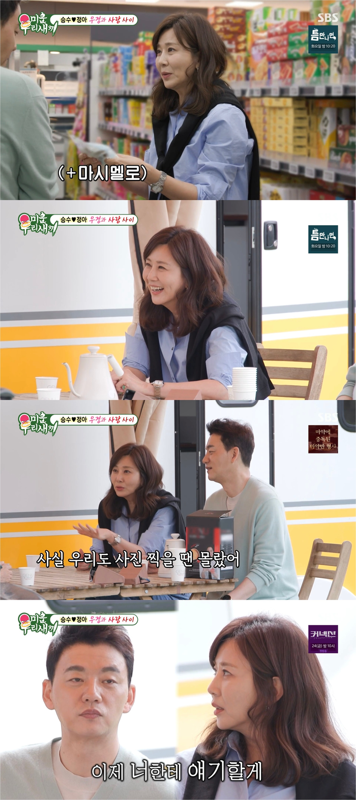 양정아는 "우리도 찍을 땐 몰랐는데 나중에 그 모습을 보니까 그제서야 '우리 둘이 잘 어울리네' 싶었다"라고 말했고 김승수는 "방송 때 정아가 우리집에 왔다. 밖에서 놀고 집에 들어왔는데 내 방에 긴 머리카락 두 개가 있어서 기분이 약간 좀 그랬다. 이틀 그냥 그대로 뒀다"라고 말해 웃음을 자아냈다.
