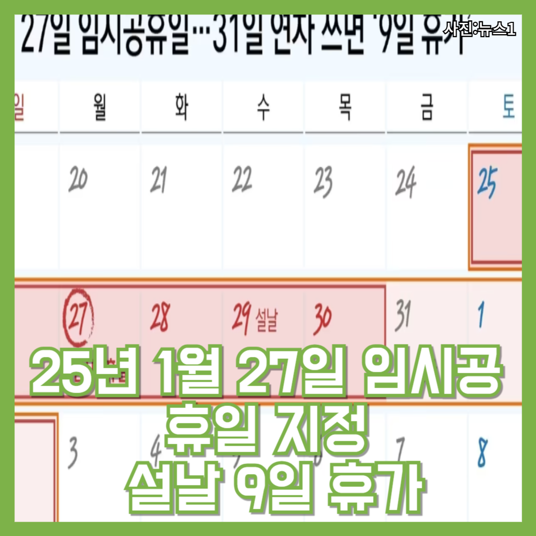 정부와 여당인 국민의힘은 설 연휴 전날인 오는 27일을 임시공휴일로 지정하기로 했다. 그로인해 올해 설 연휴는 25일 토요일부터 30일 목요일까지 6일간으로 늘어난다.