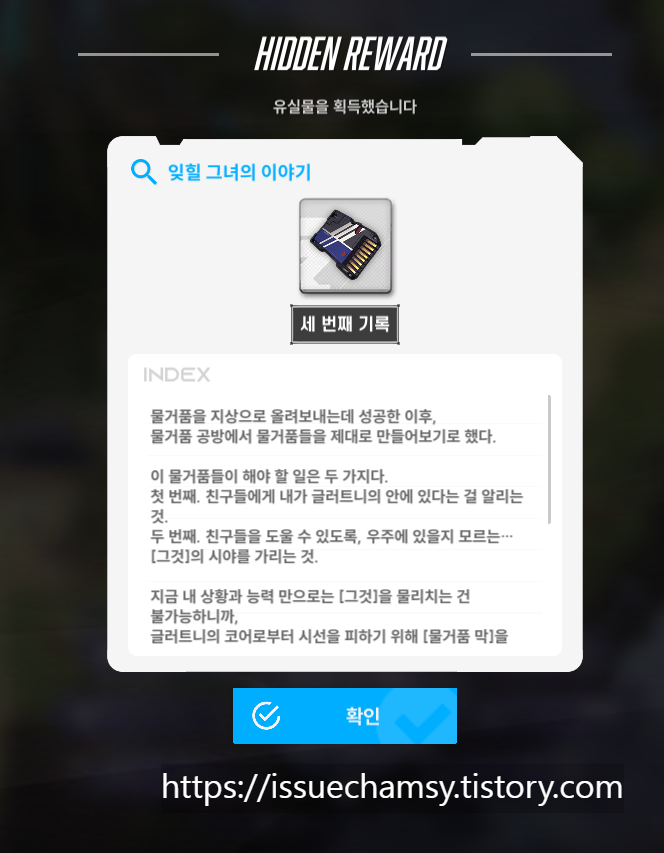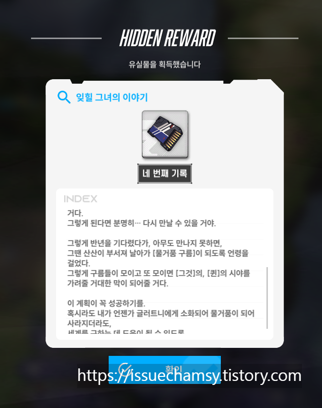 유실물 39번 (5월 8일 추가) : 잊힐 그녀의 이야기 네번째 기록 (※ 스토리 2-12 하드 진행시 획득 가능)