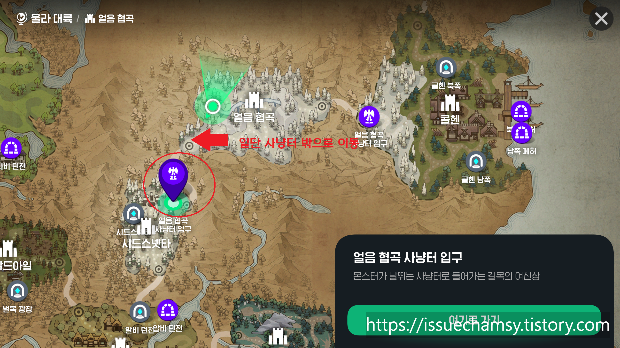 사냥터를 나간뒤 얼음협곡 난이도를 매우어려움에서 > 일반으로 설정하고 입장합니다.(중요)