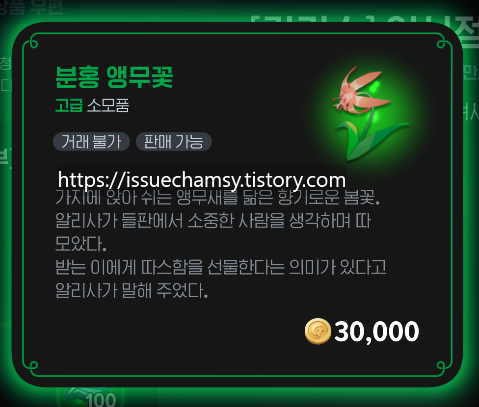인게임에서 접속하니깐 뜨는 출석부 페이지. 분홍 앵무꽃은 3만 골드로 판매가 가능하다. 또한 작은 은동전 상자(5일내 수령)로 은동전을 교환할수있다.