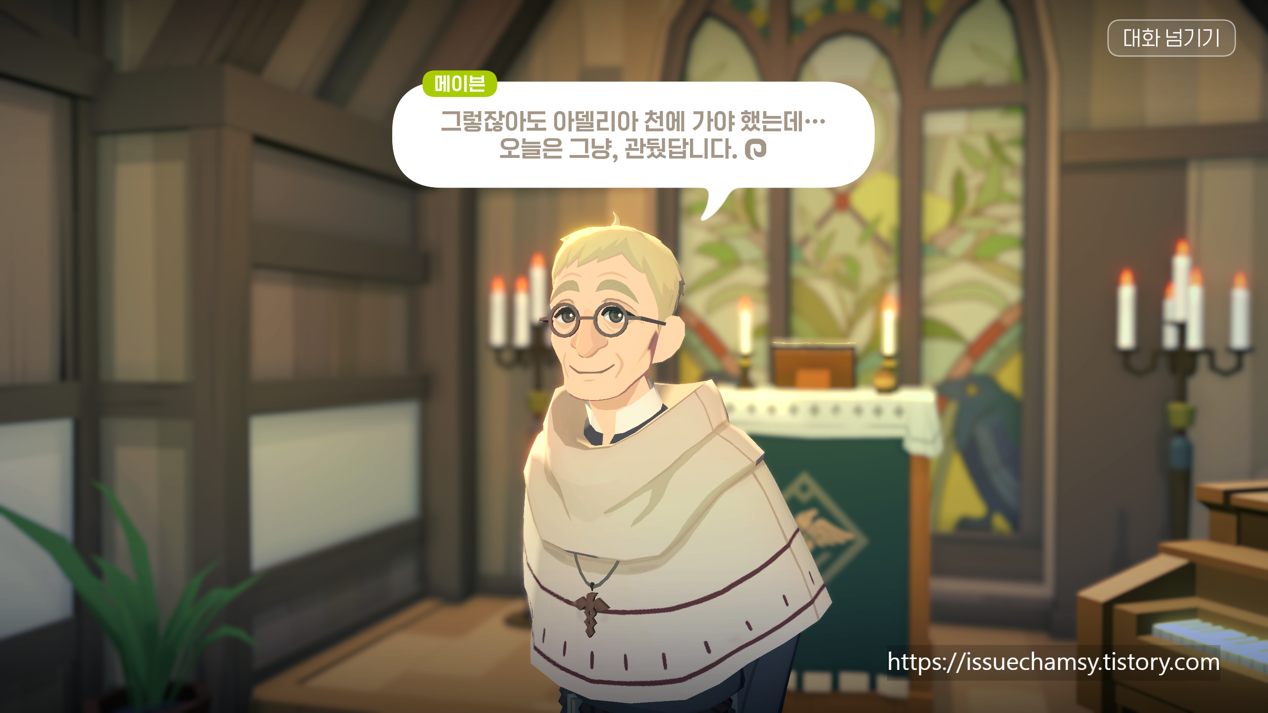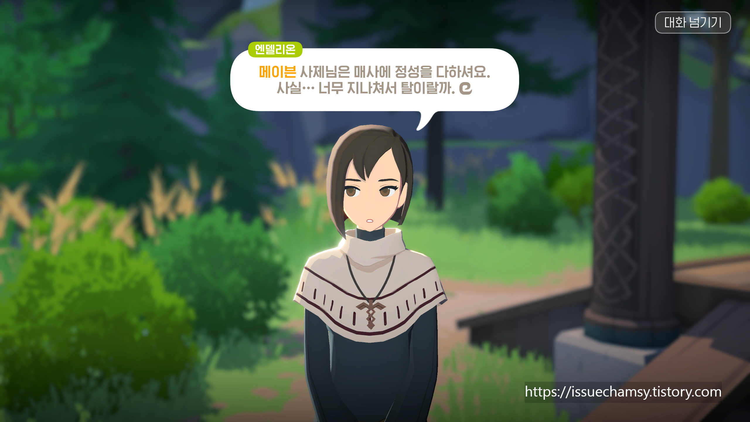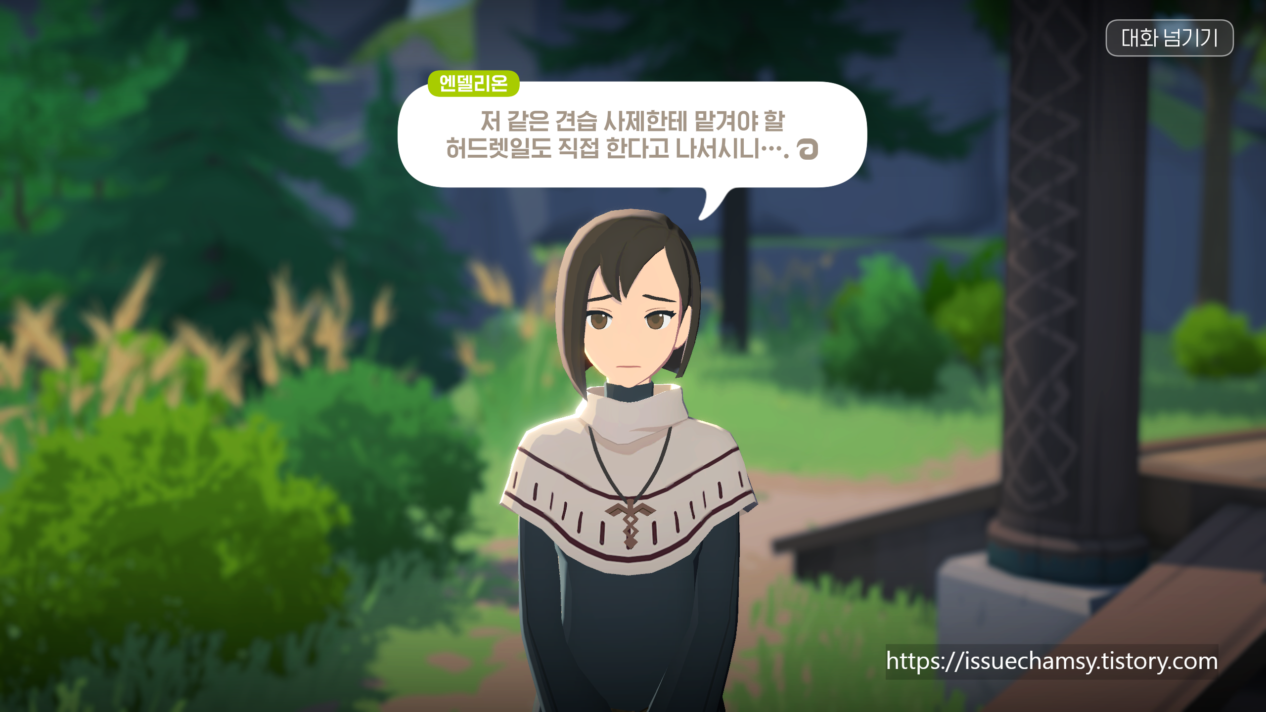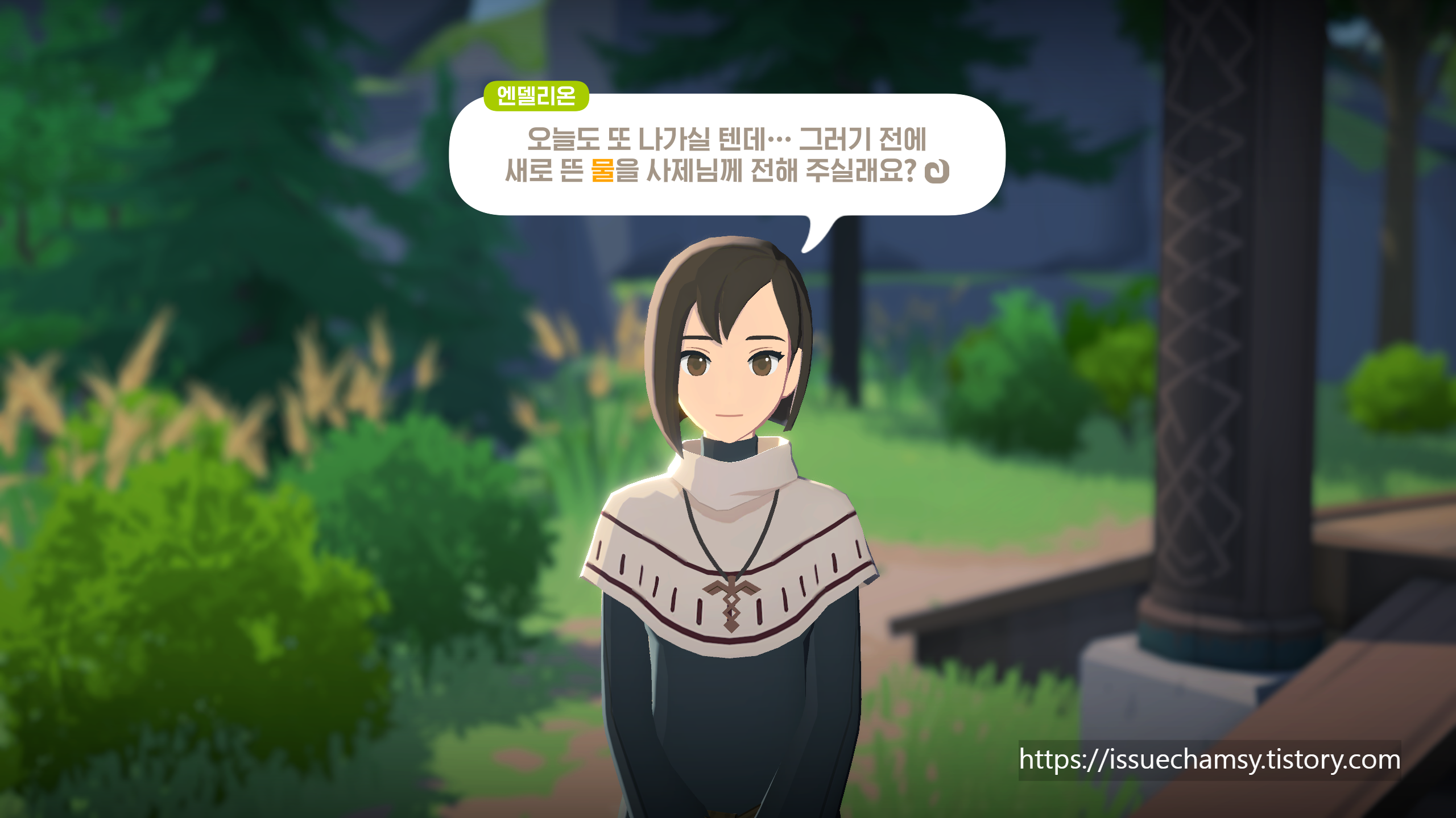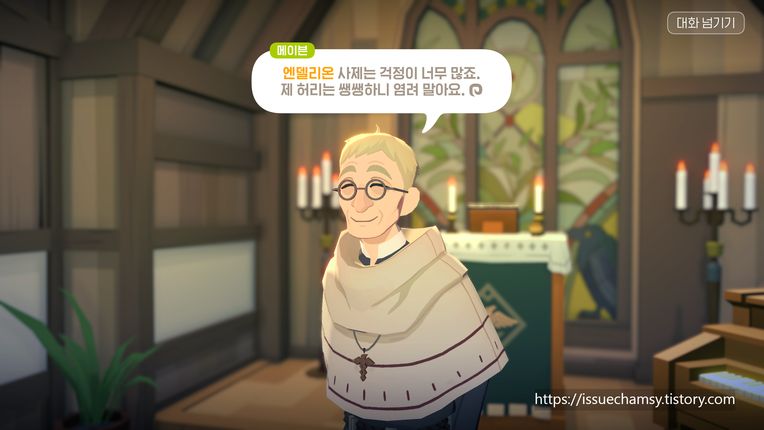 엔델리온이 메이븐 사제의 건강을 걱정하고 있습니다. 선행퀘스트 중에서 늑대의 습격으로부터 구해주는 일이 있었습니다.