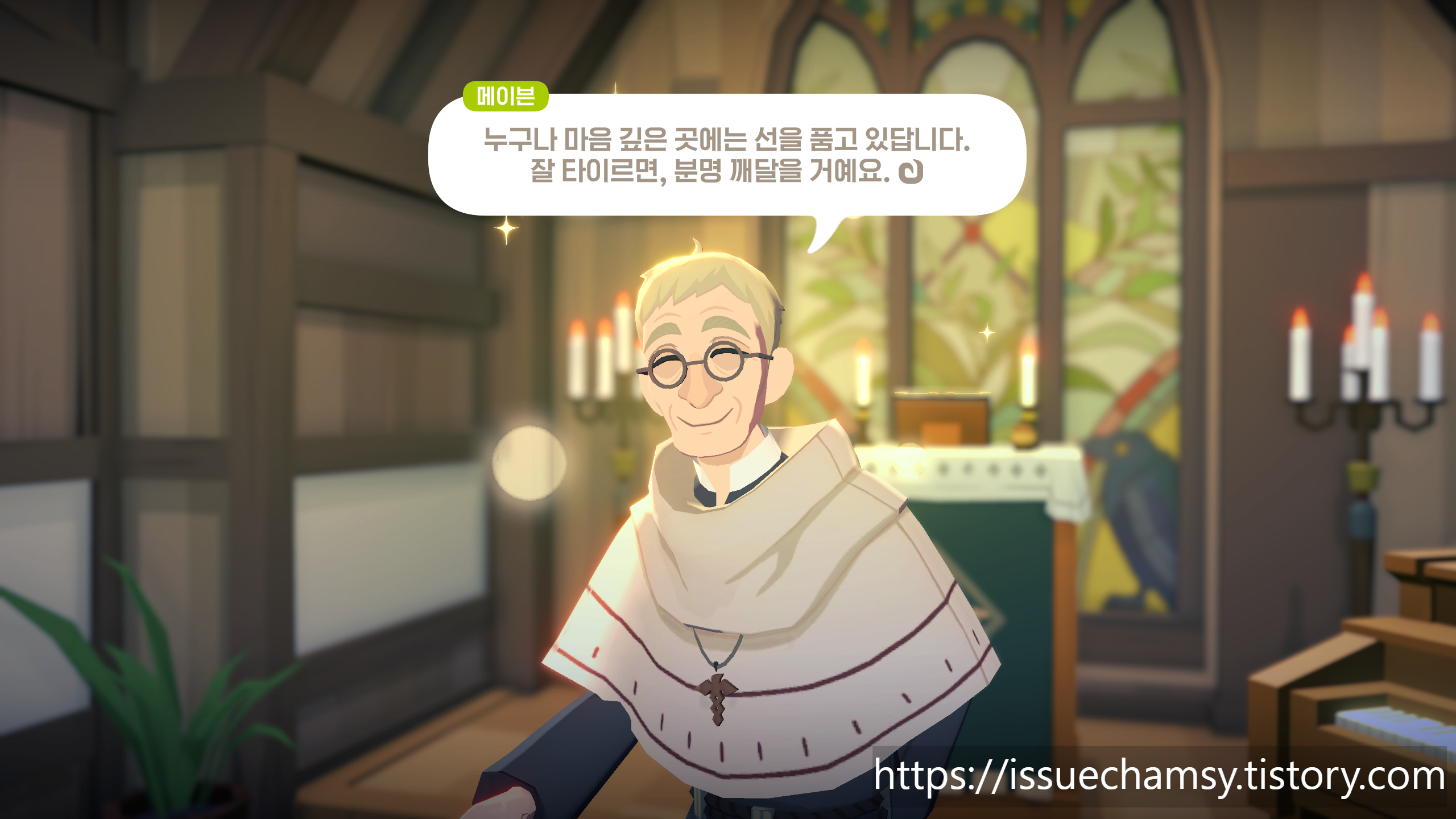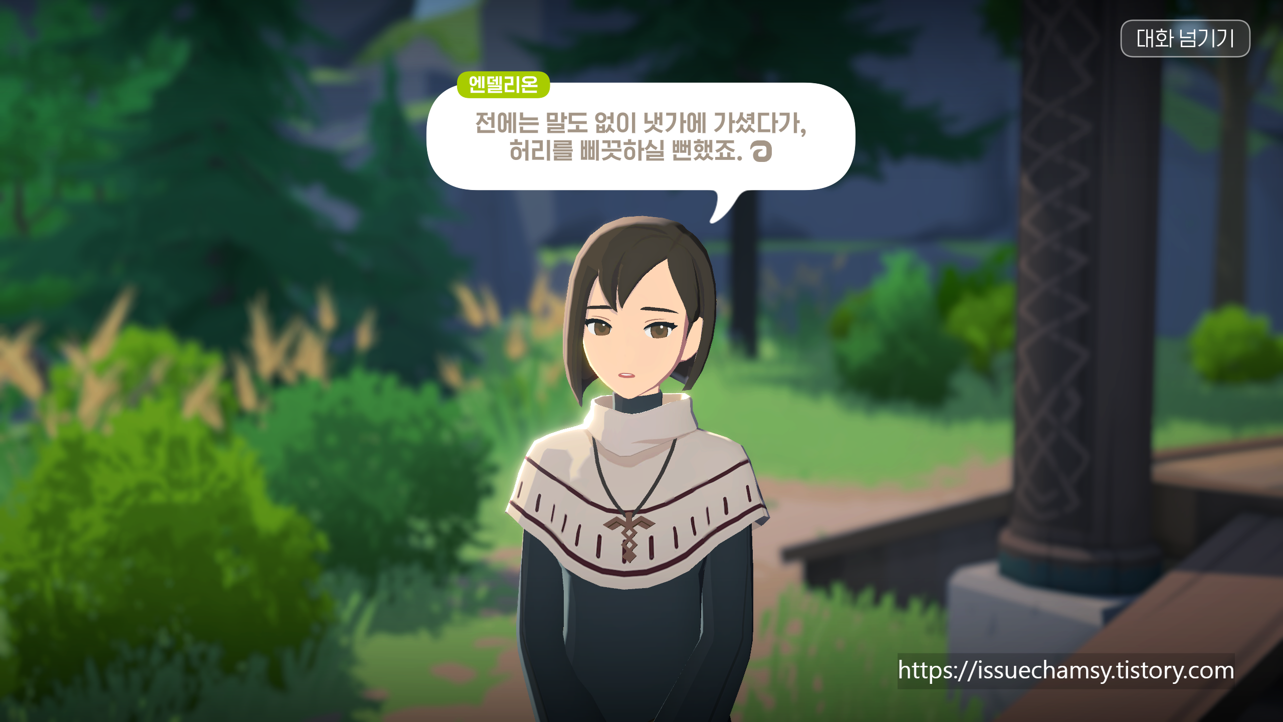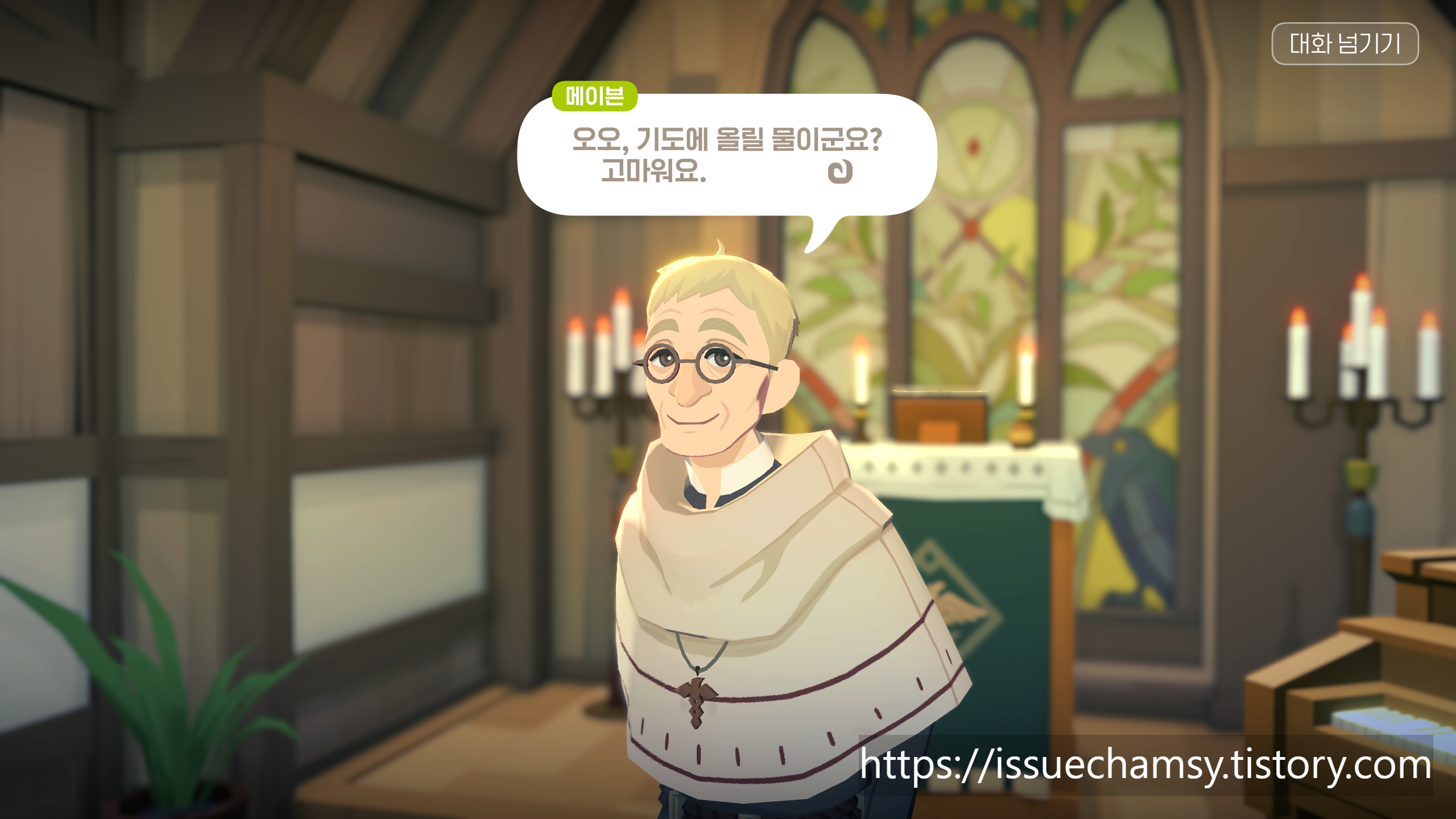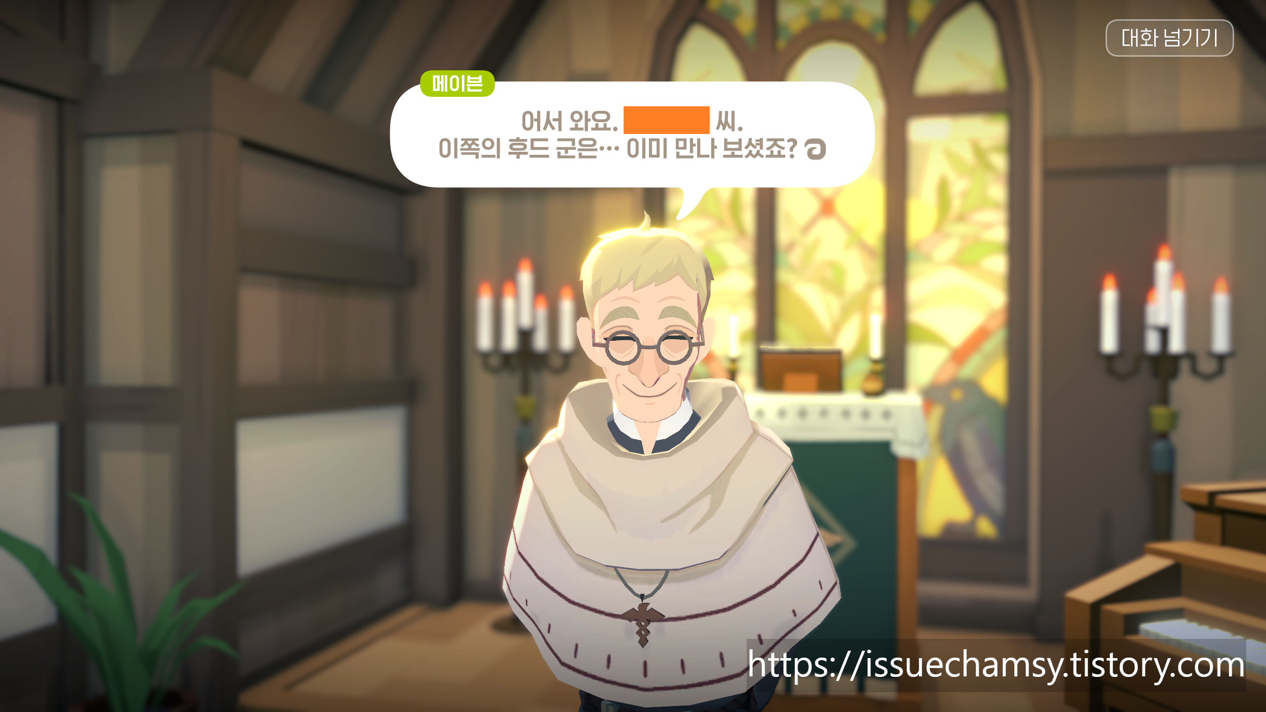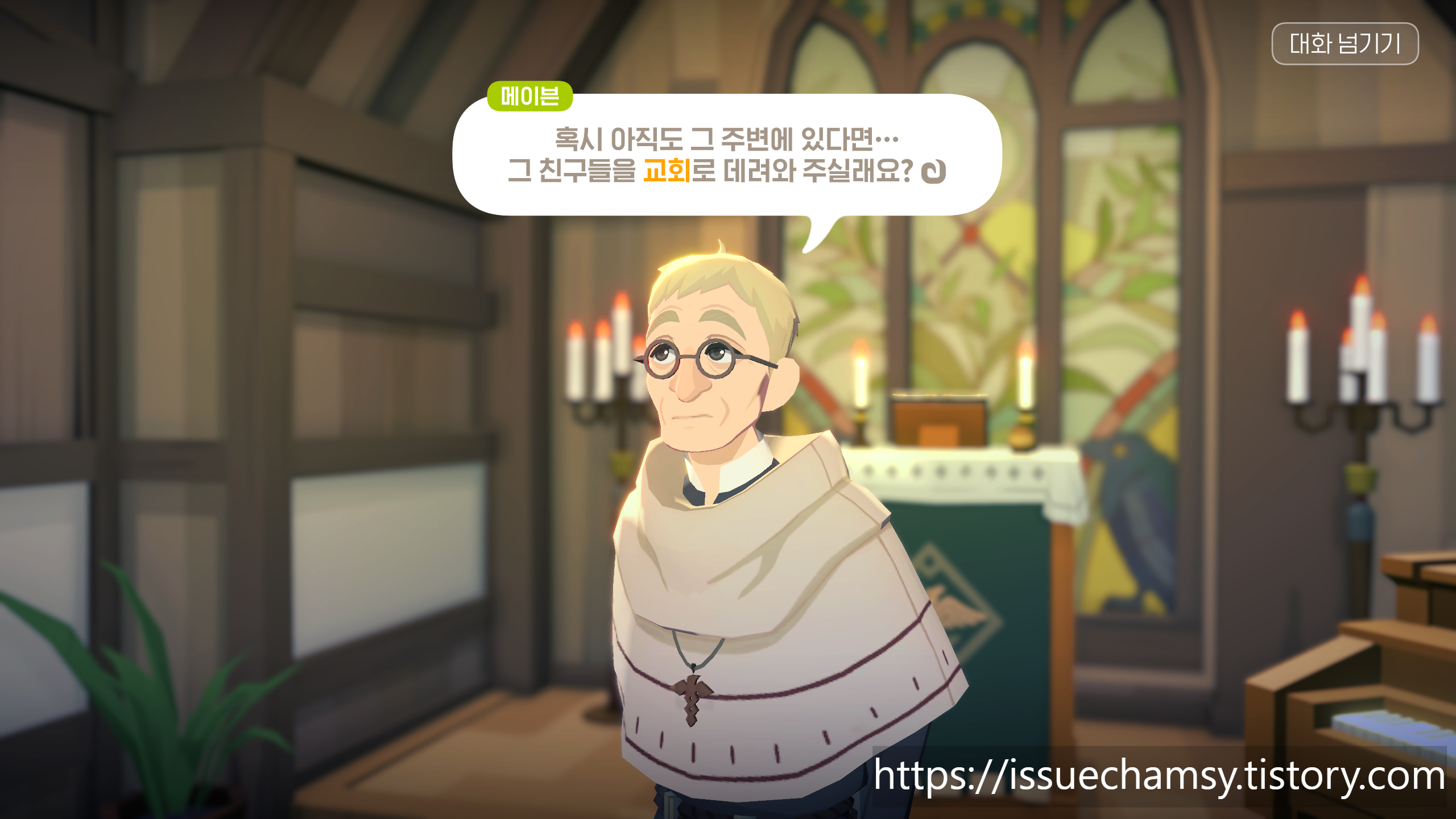 엔델리온이 메이븐 사제의 건강을 걱정하고 있습니다. 선행퀘스트 중에서 늑대의 습격으로부터 구해주는 일이 있었습니다.