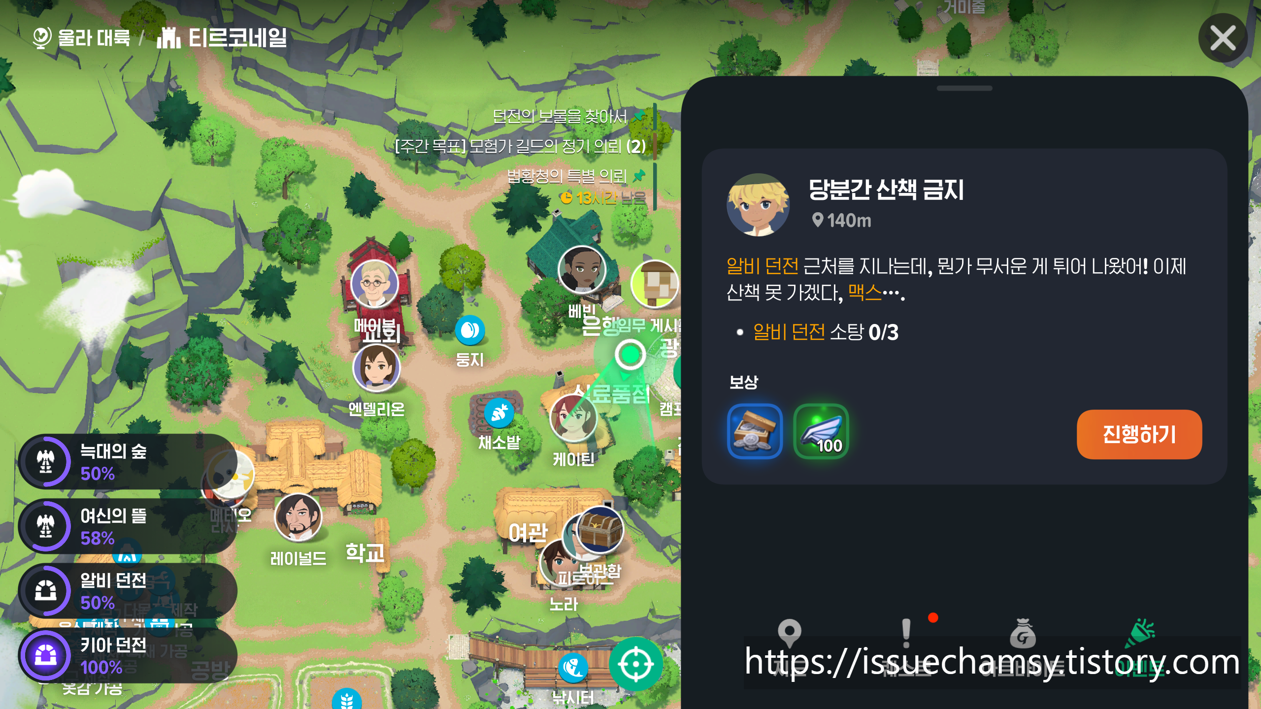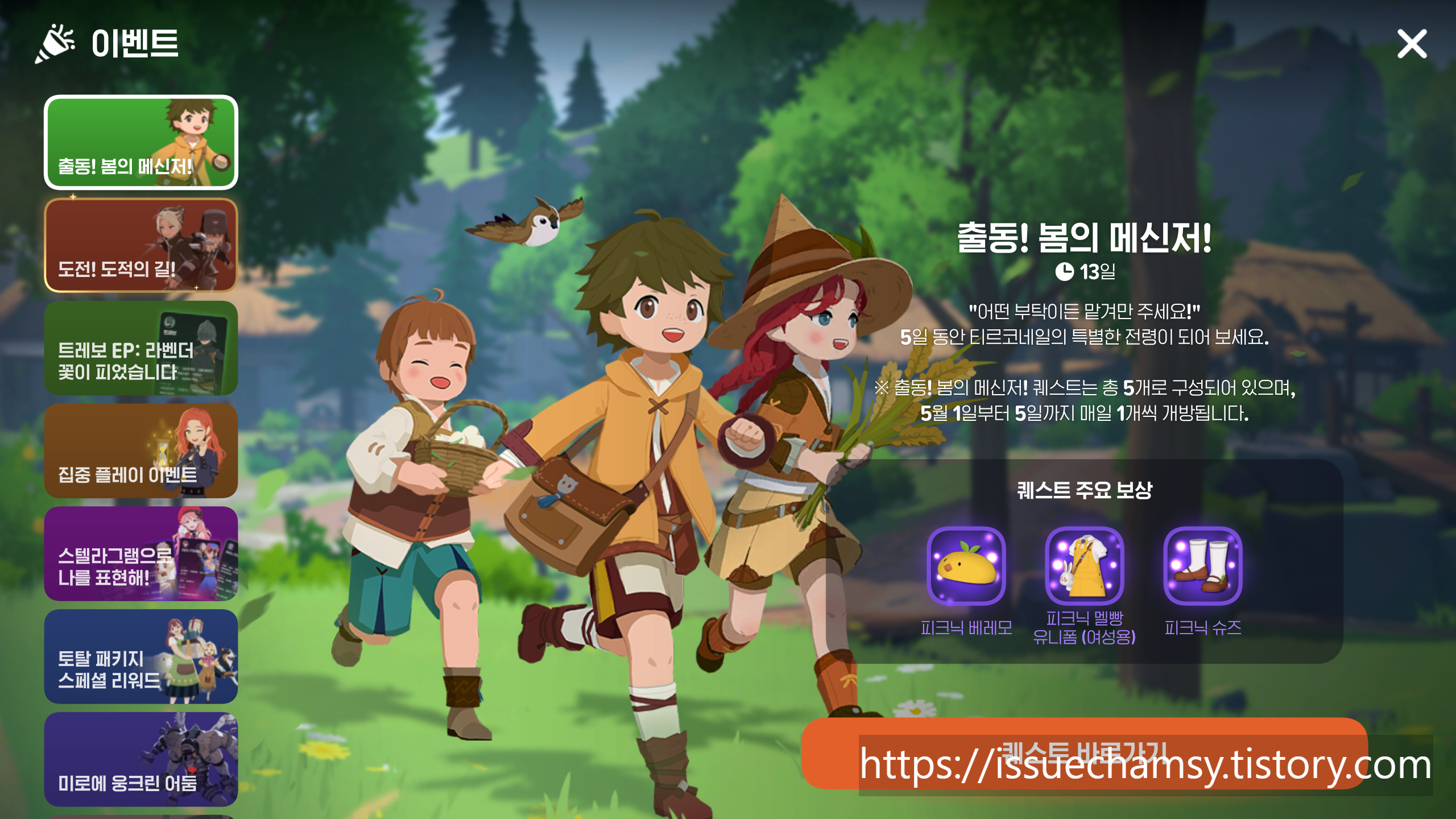 이번에는 출동! 봄의 메신저 이벤트에 대해 알아보겠습니다. 해당 퀘스트는 5일간 티르코 네일에서 매일 1개씩 오픈되는 퀘스트를 받아 진행할 수 있습니다.