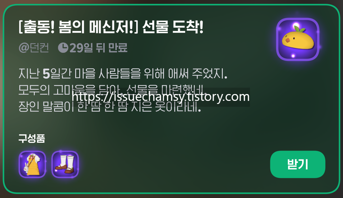 잠시뒤 우편으로 출동! 봄의 메신저! 피크닉패션이 캐릭터 우편으로 도착합니다.