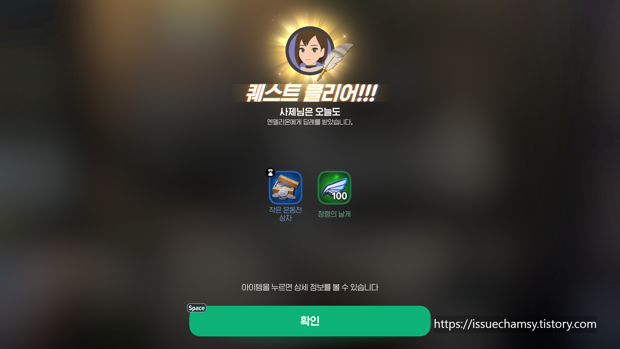 오늘 미션도 클리어! 3일차 퀘스트 보상은 작은 은동전상자(5일) 1개, 정령의날개 100개를 지급받습니다.