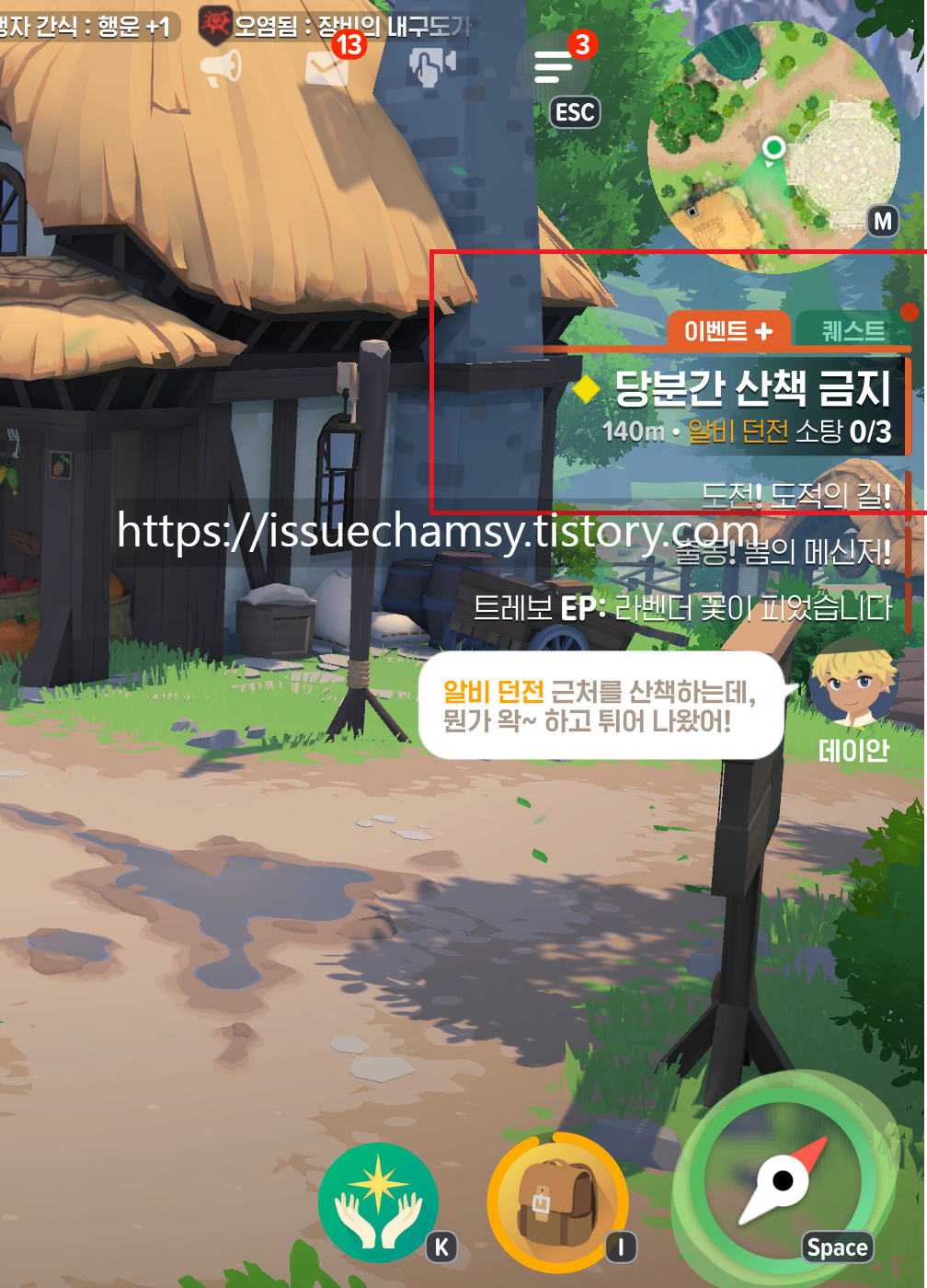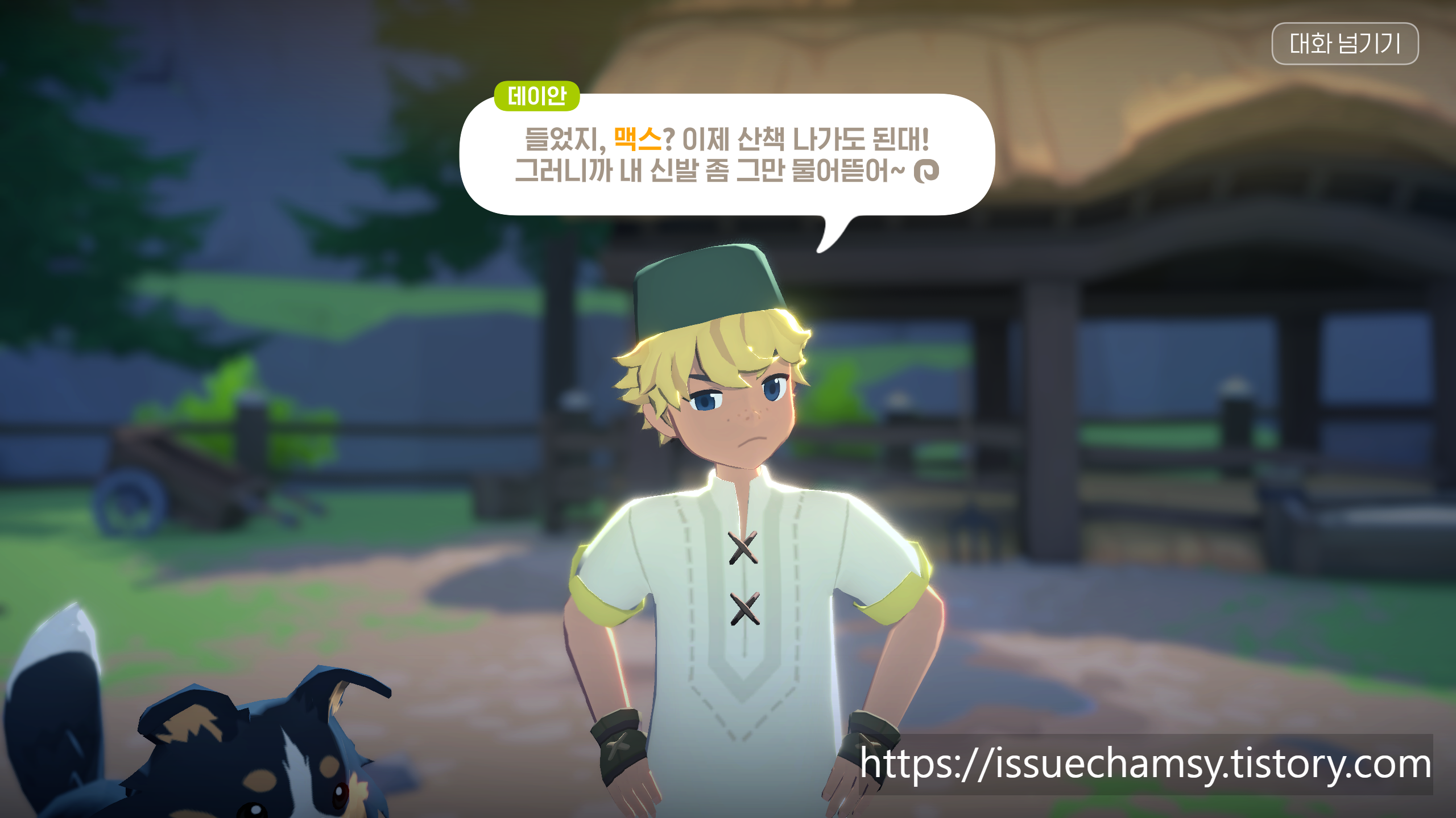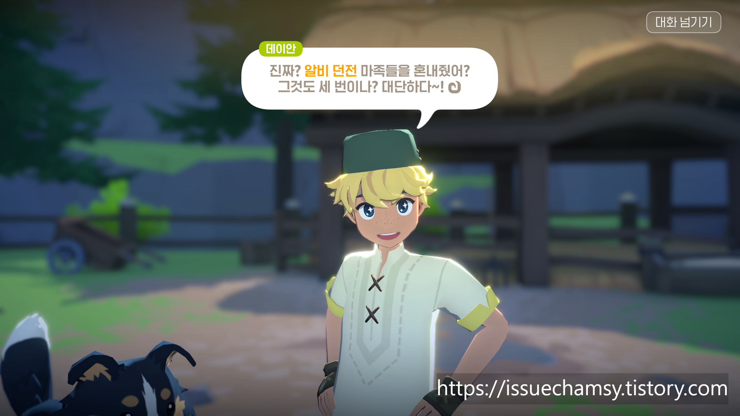 데이안이 알비던전에 맥스를 산책시키다가 몬스터가 나왔다며 소탕을 부탁했습니다.