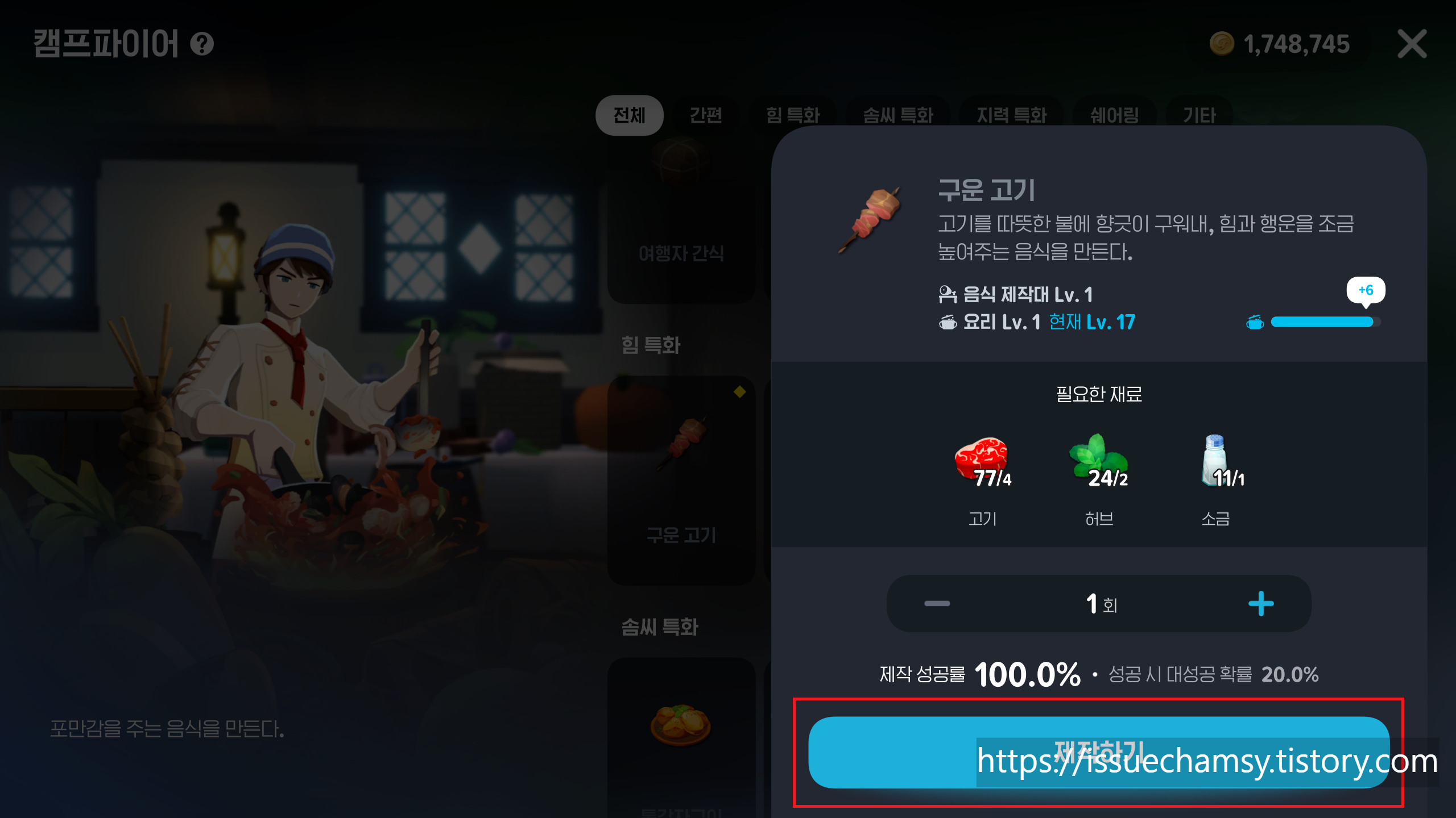 구운고기를 제작합니다. 구운고기는 고기4, 허브2, 소금1이 필요합니다.