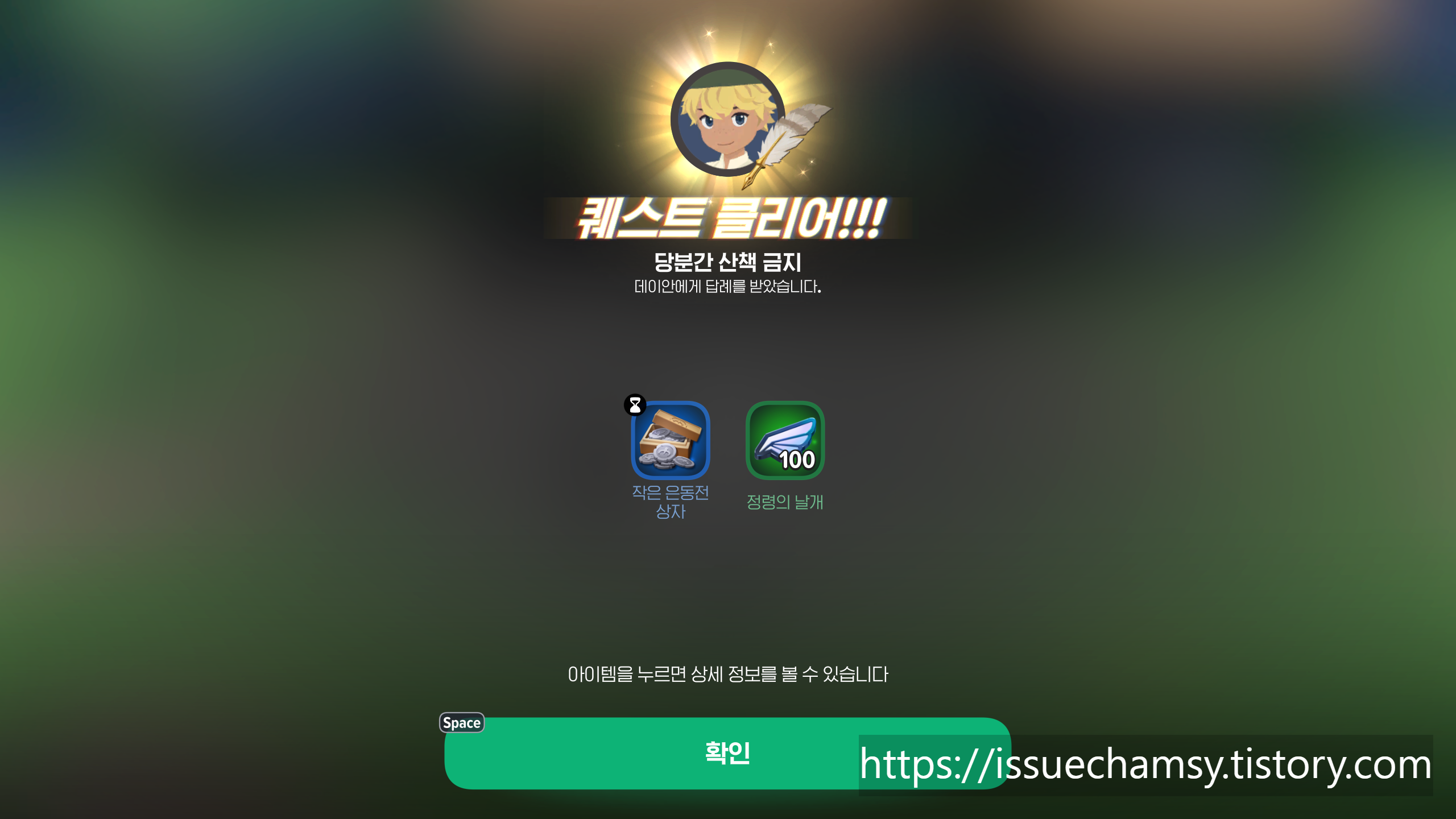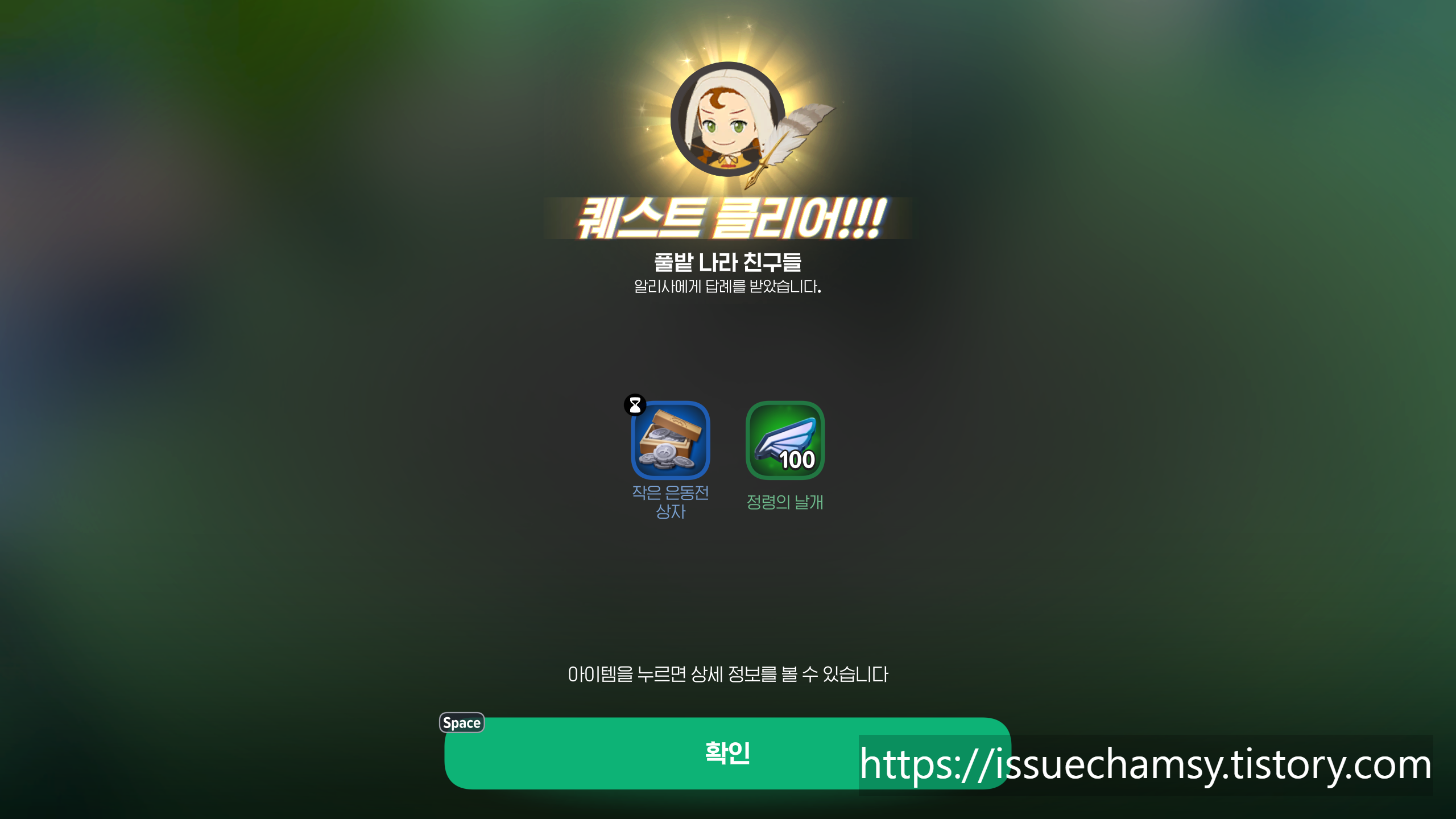 이로서 2일차 퀘스트는 완료되었습니다. 보상으로 작은 은동전상자 1개(5일), 정령의 날개를 받았습니다.
