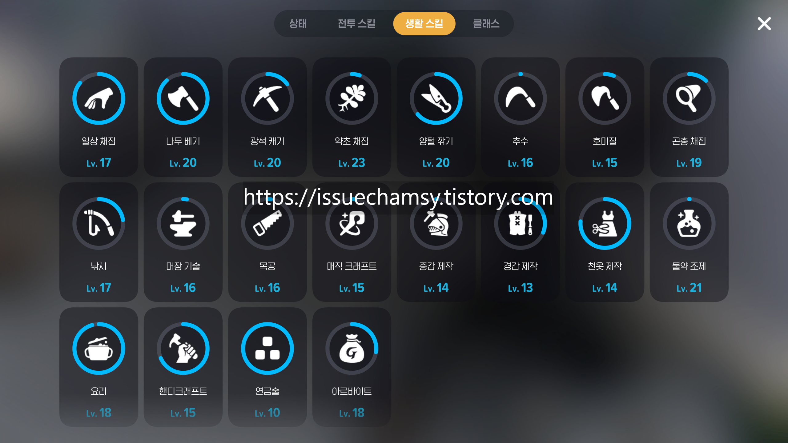 캐릭터 - 생활스킬을 클릭하고 자신이 원하는 종류의 채집방법을 선택합니다.