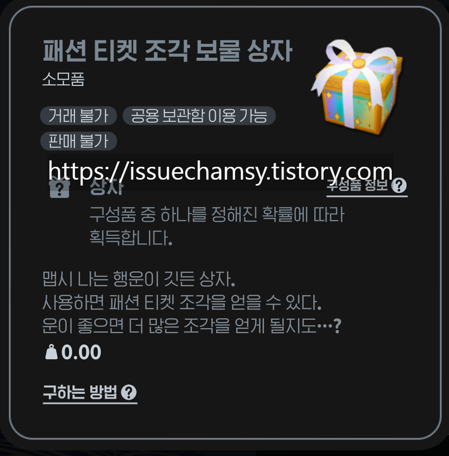 퀘스트와 심층던전 등을 클리어하면 보상으로 받는 패션 티켓 상자를 이용하여 패션 티켓 조각을 얻을수 있습니다.