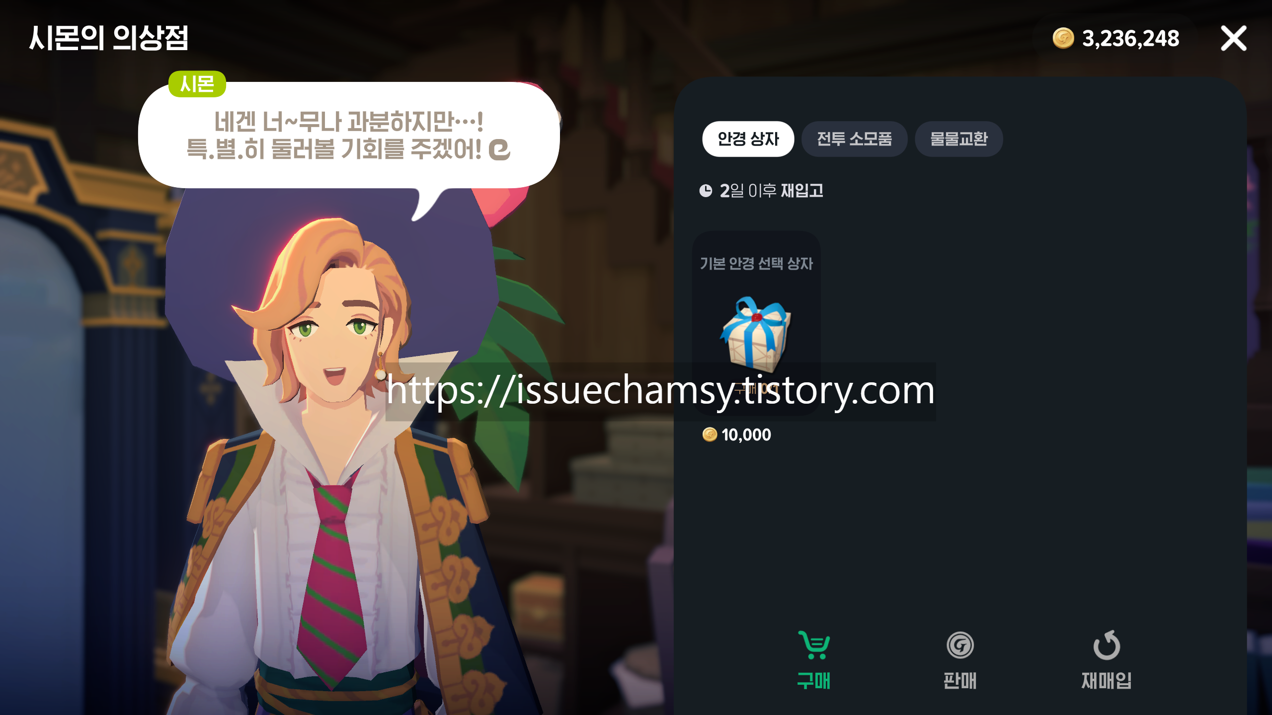 던바튼-시몬의 의상점을 이용하면 주1회 기본 안경 선택 상자를 10,000골드로 구매가 가능합니다.