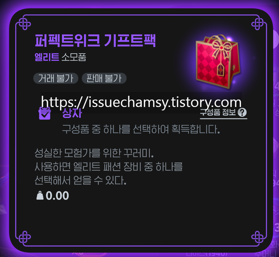 4일차에 레어 패션장비 선택 꾸러미 를 보상받고, 7일차엔 퍼펙트 위크 기프트 팩을 보상받습니다.