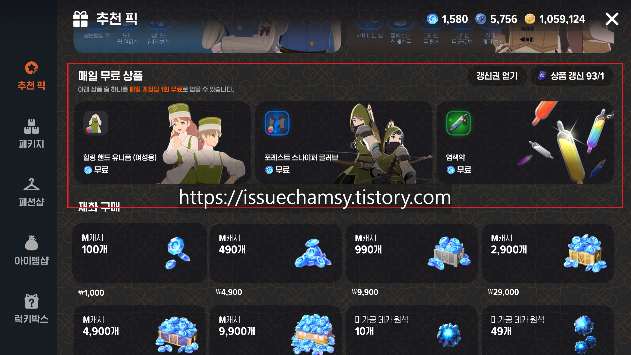간혹 마음에 들지않는 패션 아이템이나 일반등급의 패션 아이템만 나올때 무료상품을 갱신할 수 있는데요