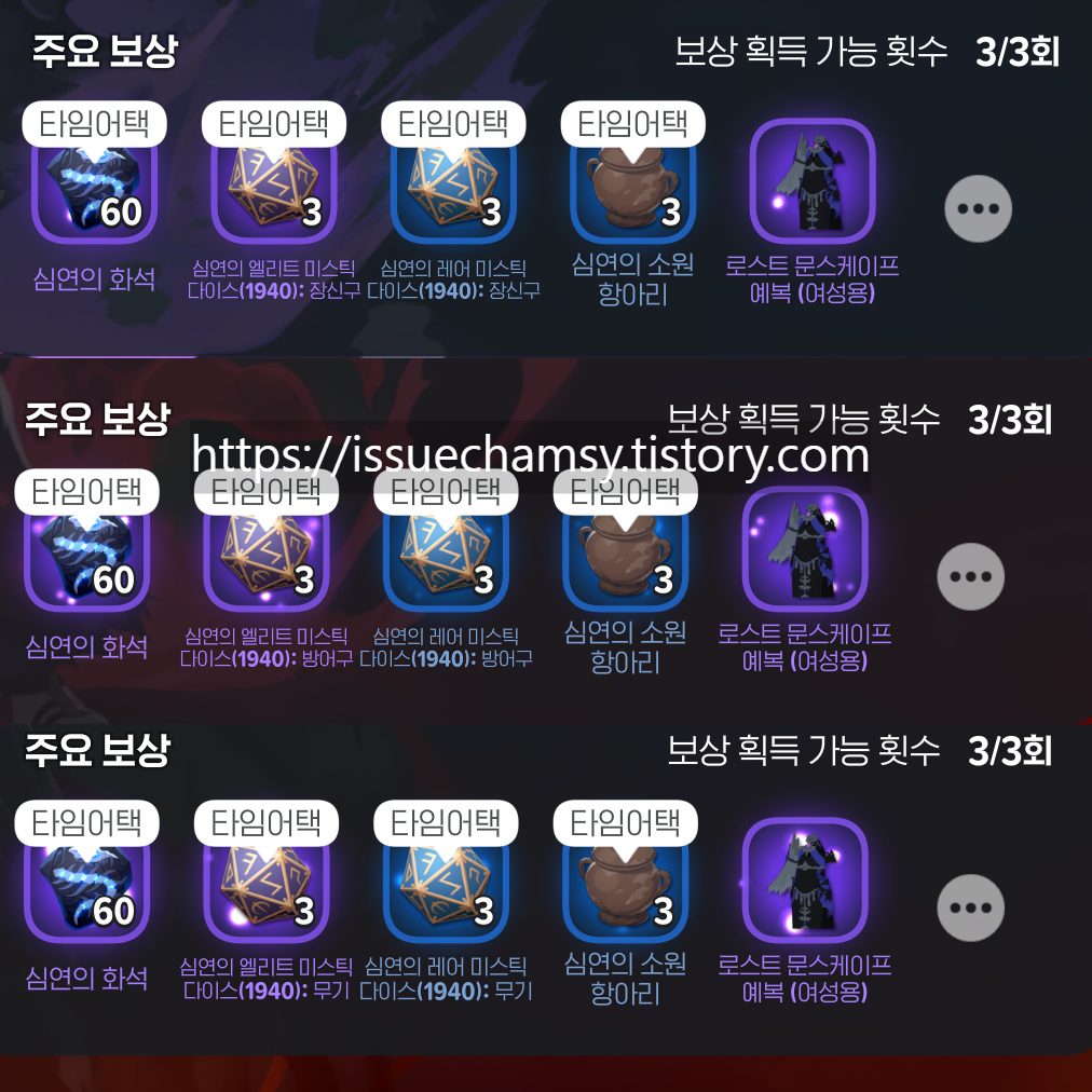 심연의 엘리트 다이스 장신구3개, 심연의 레어 다이스 장신구3개, 심연의 소원 항아리 3개, 심연의 화석 60개 획득 |