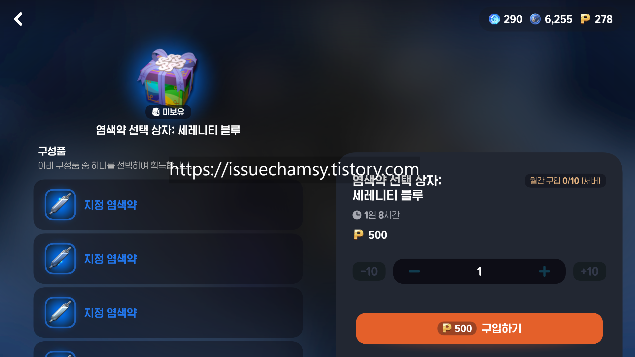 지정염색약(지염)은 캐시샵 매일무료 상품에서 랜덤으로 획득하거나 캐시샵 포인트로 구매하는 지정염색 선택상자에서 구매하시는것도 좋은 방법입니다. 부위별로 염색을 선택한다는점이 매력적입니다.