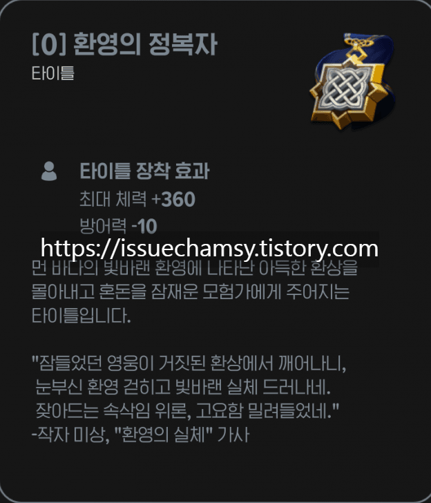 타이틀 장착효과로는 최대체력 +260, 방어력-10 입니다.
