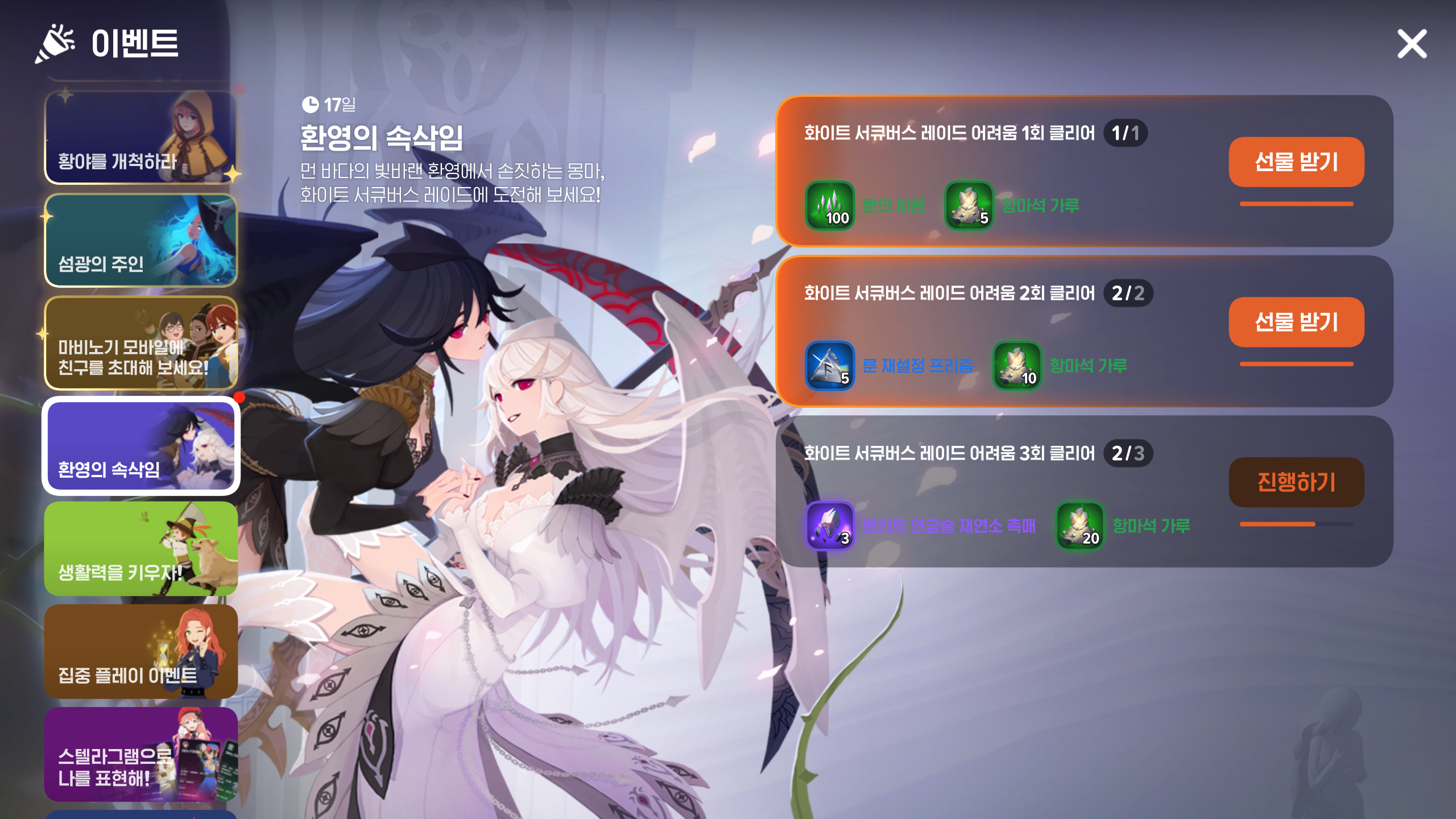 화이트 서큐버스 퀘스트 1~3회 클리어시 다양한 보상을 받을수 있습니다. 꼭 클리어 하여 보상을 챙겨가시길 바랍니다!