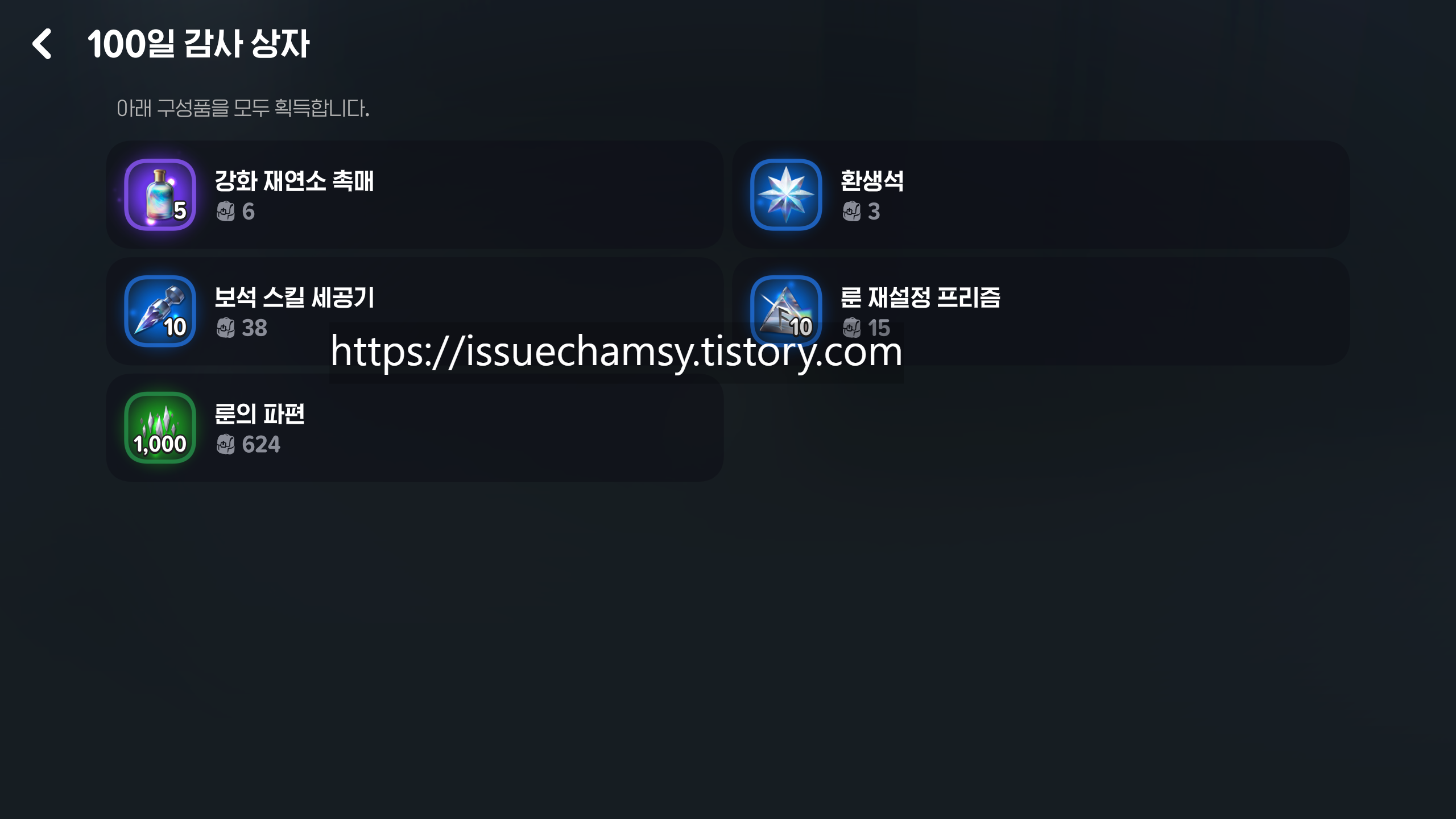 | 성장 지원 상자 | 골드,룬의 파편,재연소 촉매 | 100,000골드 / 300개 / 3개 |