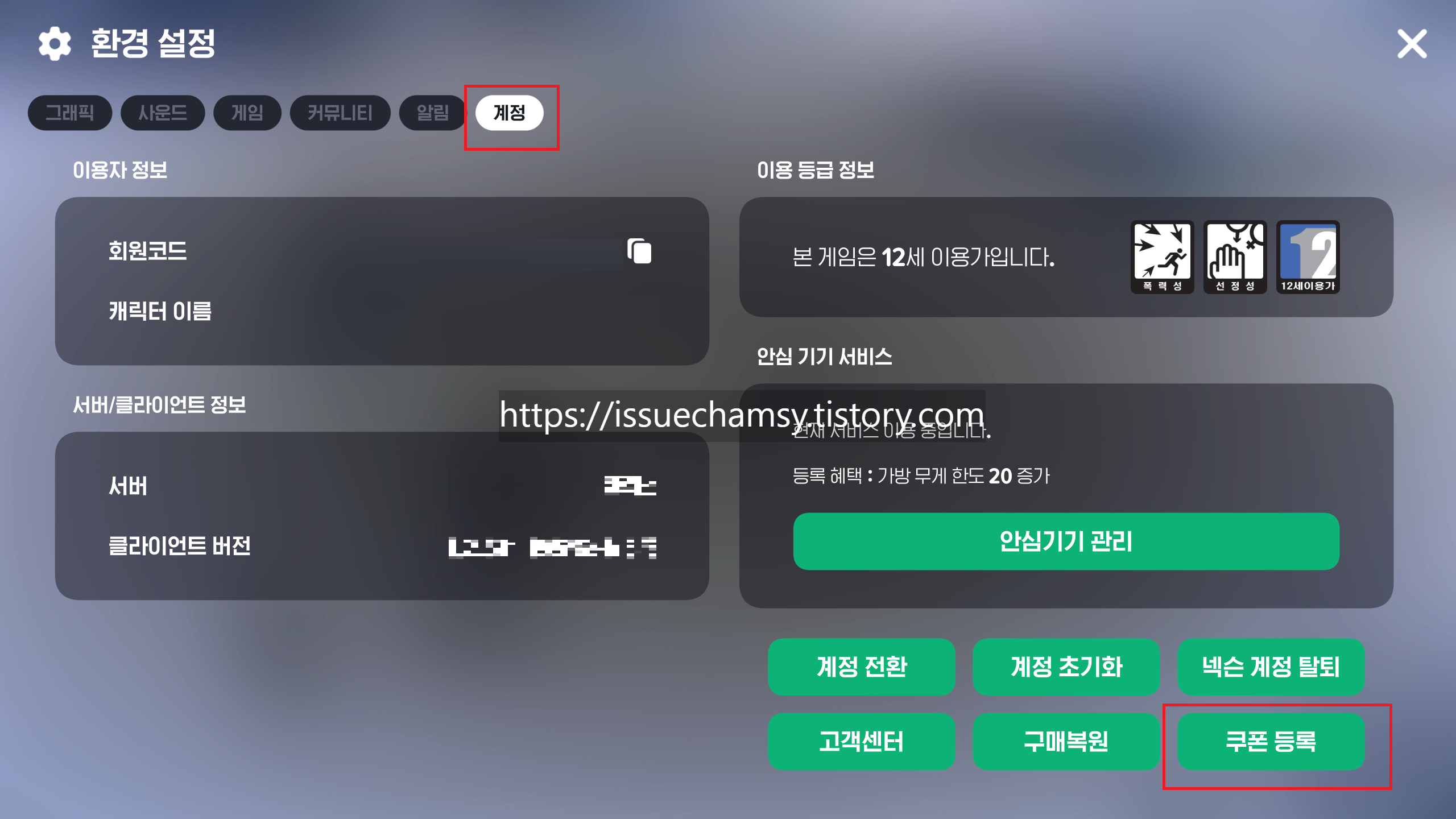 상단의 계정 탭에 들어가셔서 우측 하단의 쿠폰등록을 눌러줍니다.